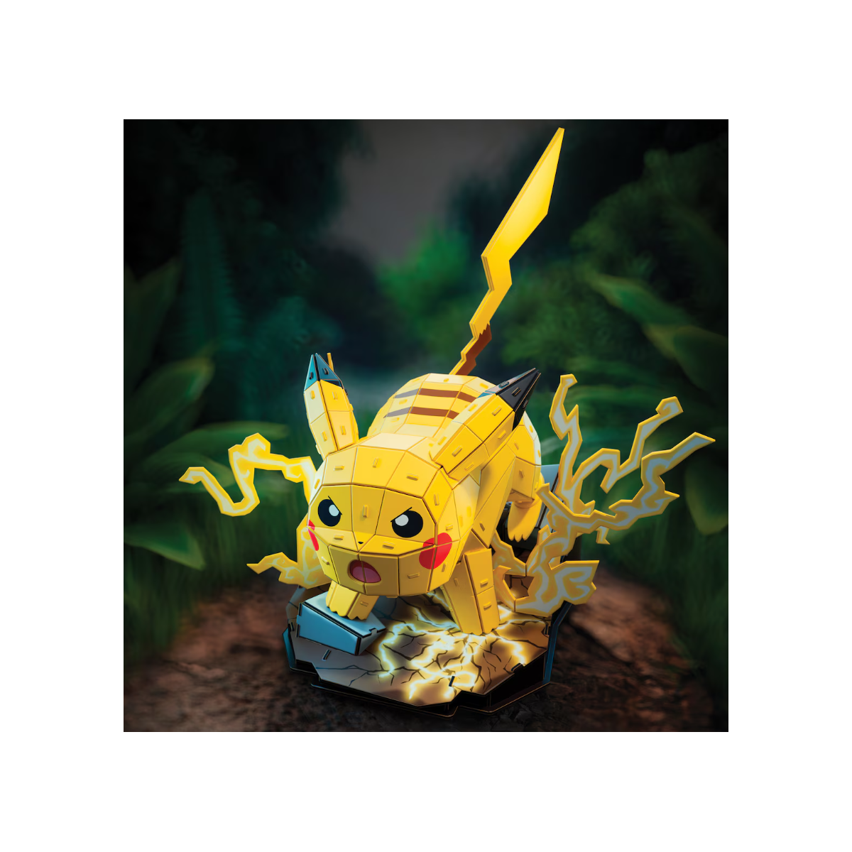 El modelo reproduce a Pikachu preparado para lanzar un ataque eléctrico, con su cola levantada y rayos que salen de la base. Una vez montado, el resultado es una figura muy llamativa diseñada para exponer en estanterías, escritorios o colecciones Pokémon.