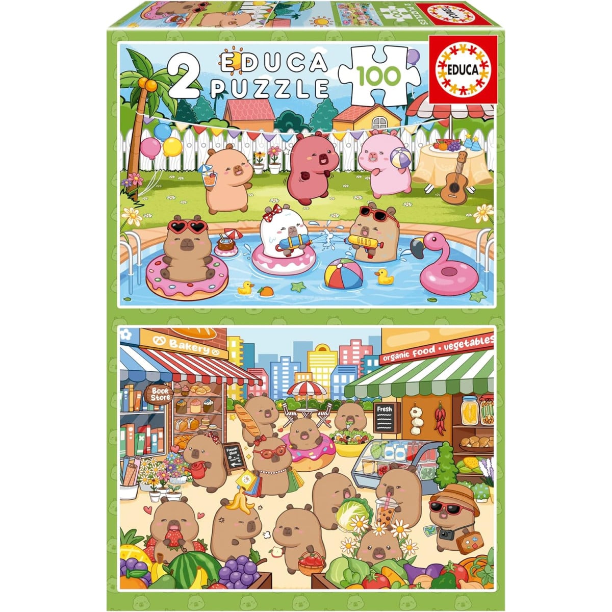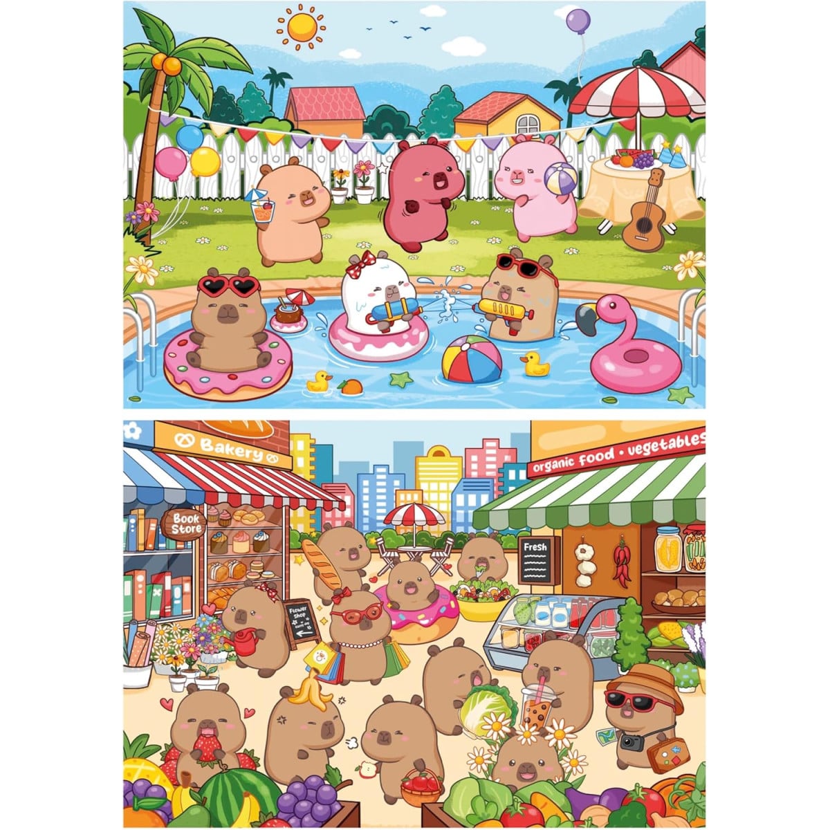 - Diseño: Set de 2 puzzles con ilustraciones divertidas de capibaras en escenas veraniegas y de mercado, llenas de color y detalles.