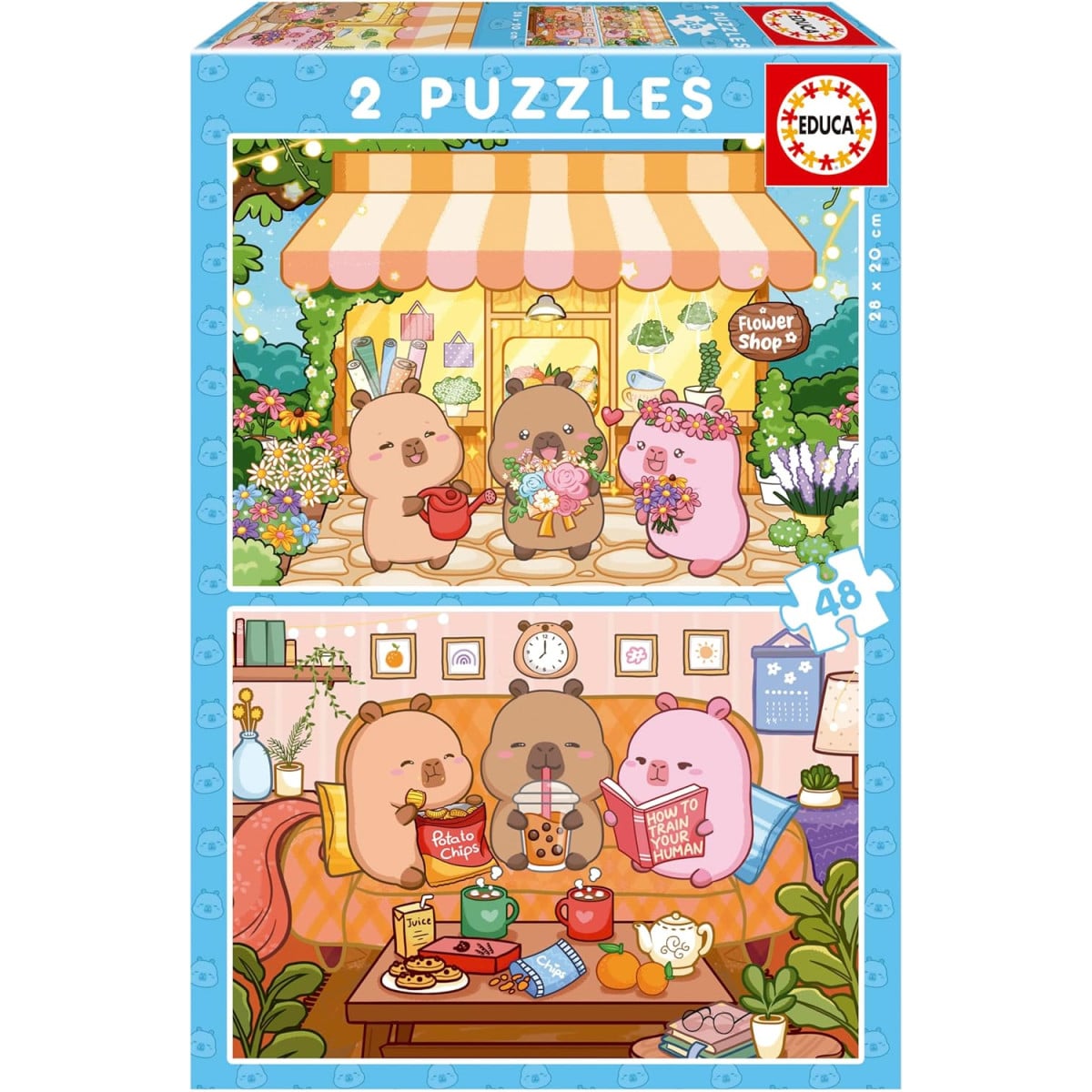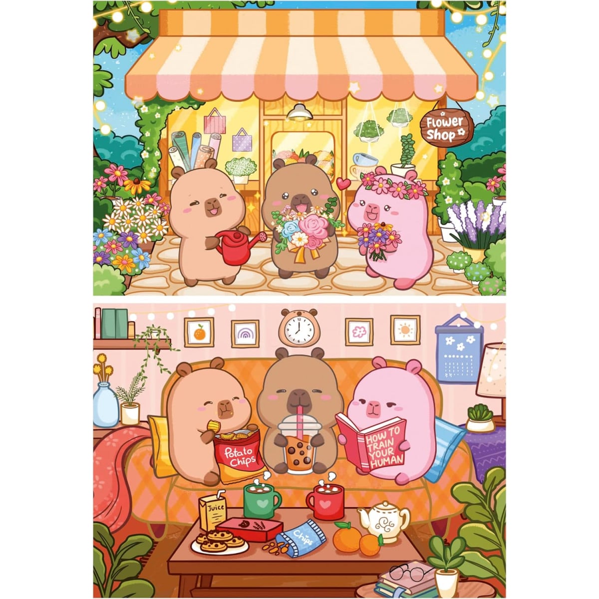 - Diseño: Set de 2 puzzles con ilustraciones adorables de capibaras en escenas cotidianas llenas de color y detalles.