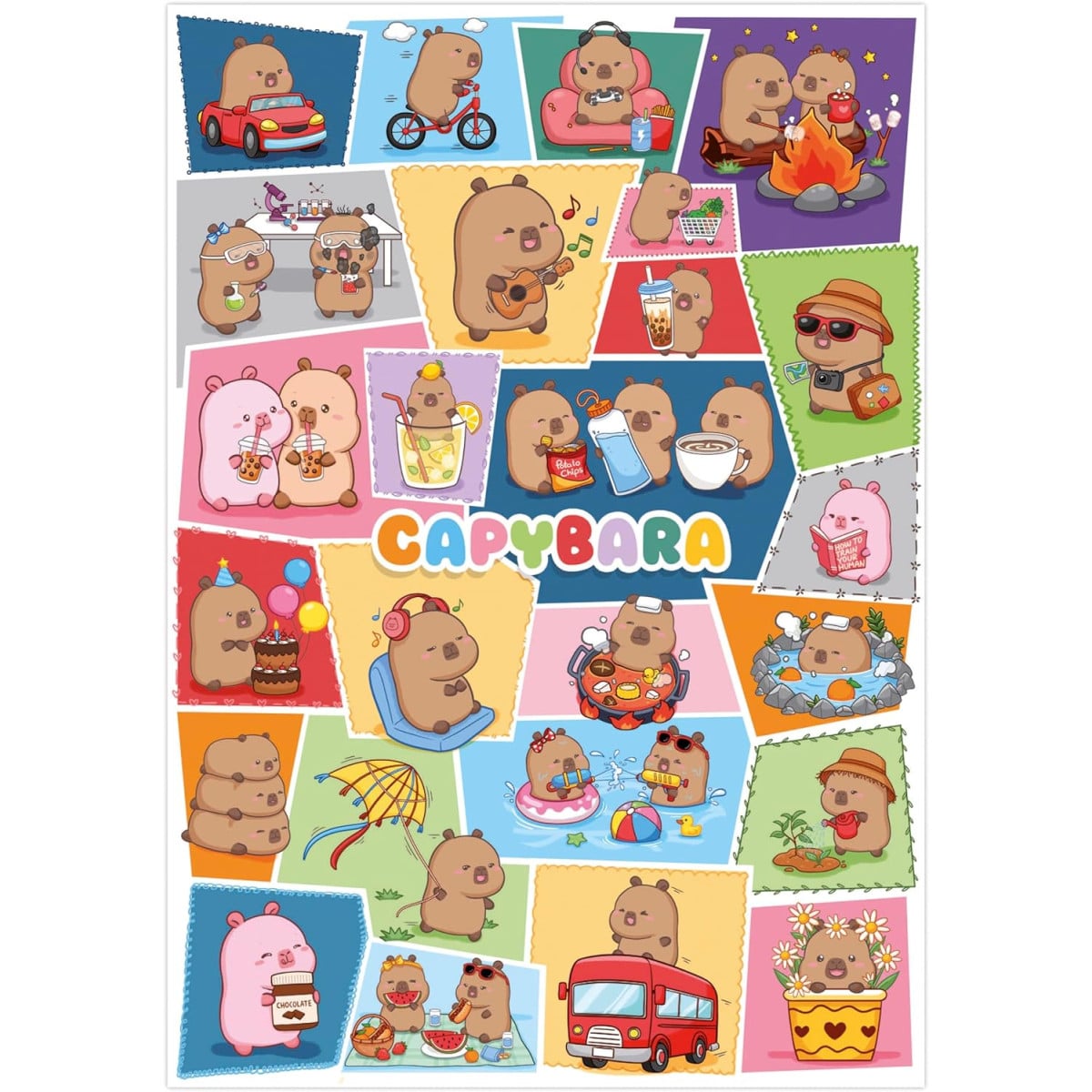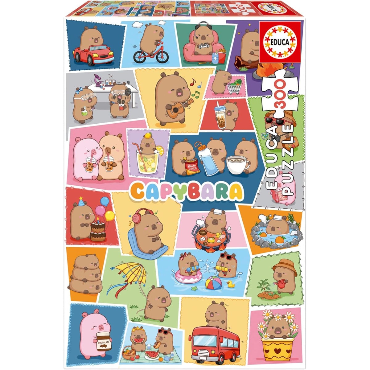 El Puzzle Capyfun destaca por su diseño original y lleno de escenas divertidas protagonizadas por adorables capibaras en distintas situaciones cotidianas. Cada parte del puzzle muestra una pequeña historia, con colores suaves y detalles simpáticos que hacen que montar la imagen completa sea una experiencia muy entretenida y diferente.