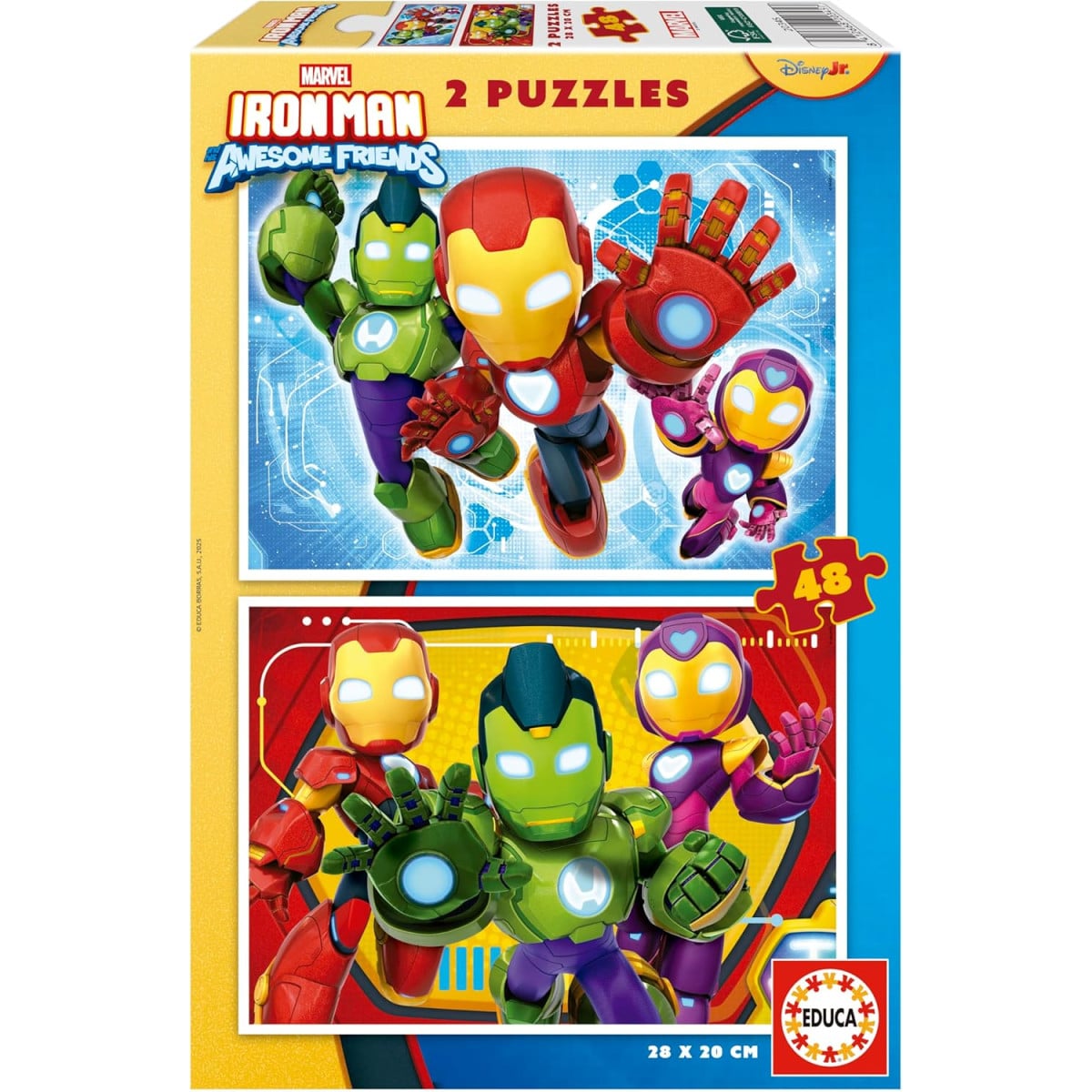 - Diseño: Set de 2 puzzles con ilustraciones de Iron Man y sus amigos, con colores vivos y escenas llenas de acción que llaman la atención de los peques.