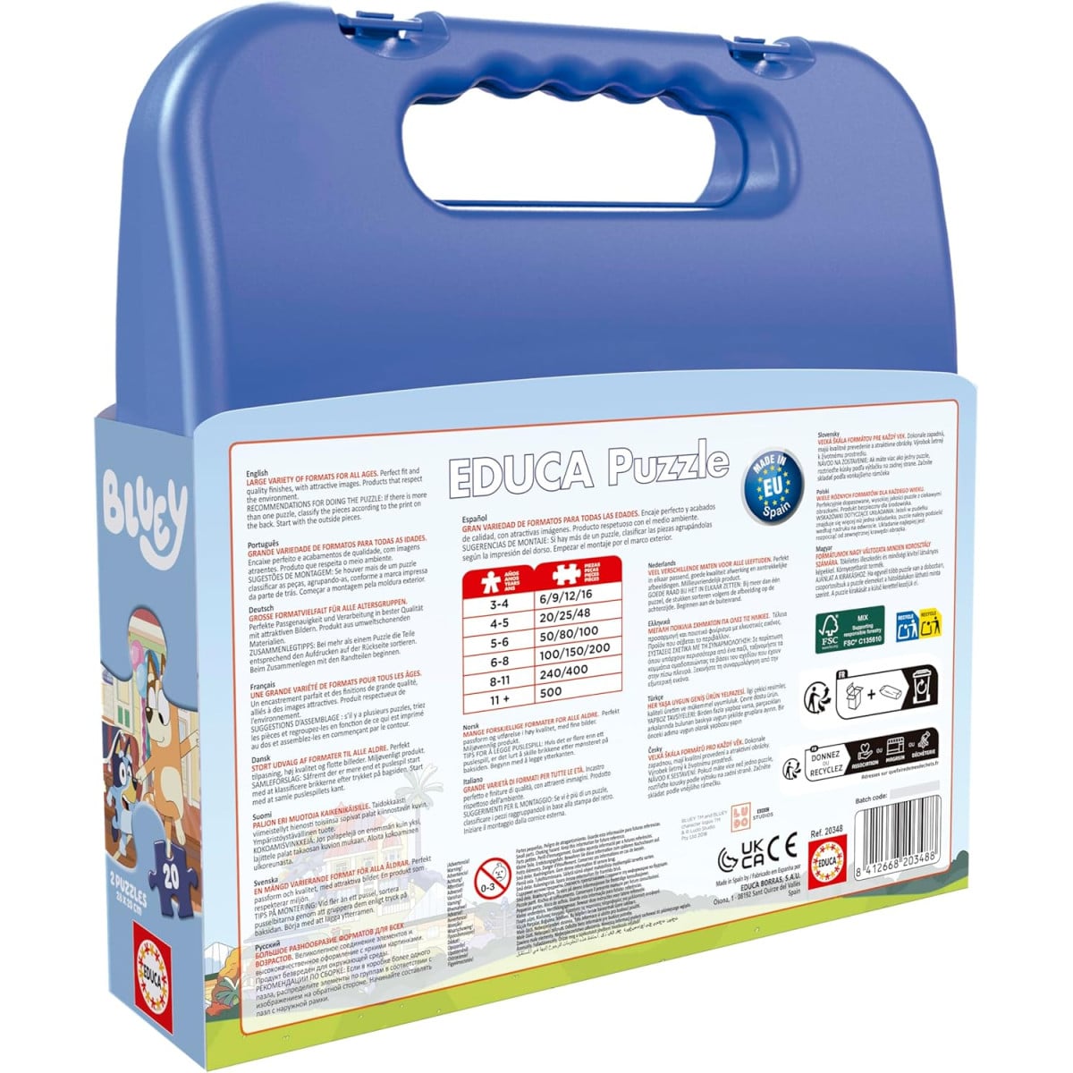 Descubre el Puzzle Maleta Bluey Y Su Familia, con dos puzzles de 20 piezas y práctico formato portátil. Ideal para niños y niñas que empiezan con puzzles y quieren disfrutar en casa o llevarlos a cualquier lugar.