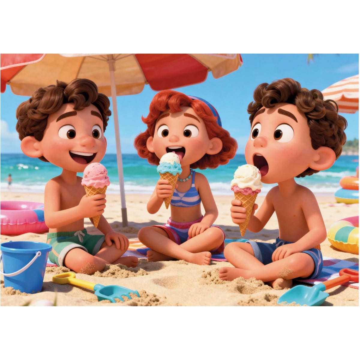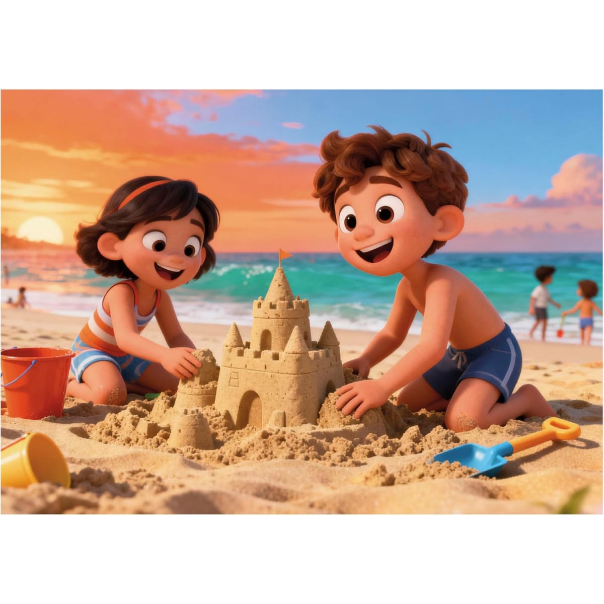 - Diseño: Set de puzzles progresivos con temática veraniega en la playa, con escenas divertidas de niños jugando, haciendo castillos de arena y practicando surf.