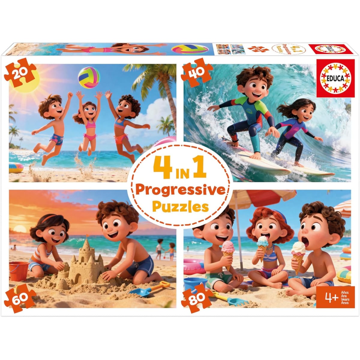 Cada puzzle Educa presenta una dificultad creciente (20, 40, 60 y 80 piezas), permitiendo avanzar poco a poco y ganar confianza con cada montaje. Desde juegos en la arena hasta actividades en el agua, las escenas están pensadas para mantener el interés mientras se mejora la coordinación y la atención.