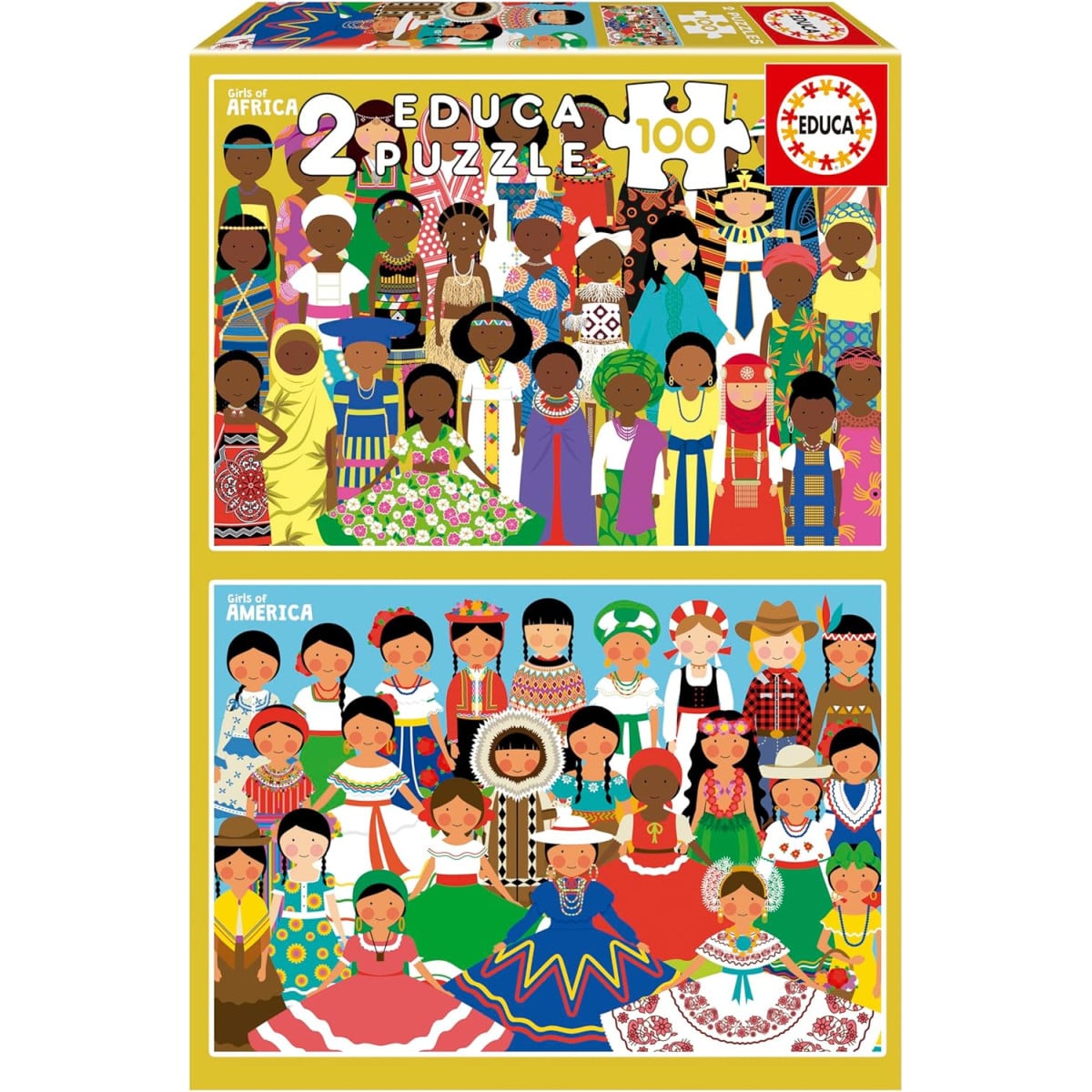 El Puzzle Niñas De América Y África propone una experiencia muy visual gracias a sus dos ilustraciones llenas de color y personalidad. Cada puzzle representa distintas culturas a través de personajes con trajes tradicionales, creando escenas muy llamativas que invitan a fijarse en los pequeños detalles mientras se avanza en el montaje.
