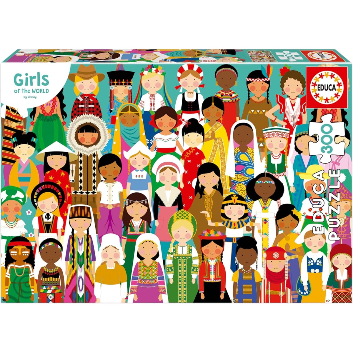 El Puzzle Niñas Del Mundo presenta una ilustración repleta de personajes de diferentes culturas, creando una escena muy variada y llena de color. Cada zona del puzzle ofrece pequeños detalles en la vestimenta y los estilos, lo que hace que el montaje sea dinámico y entretenido en todo momento.