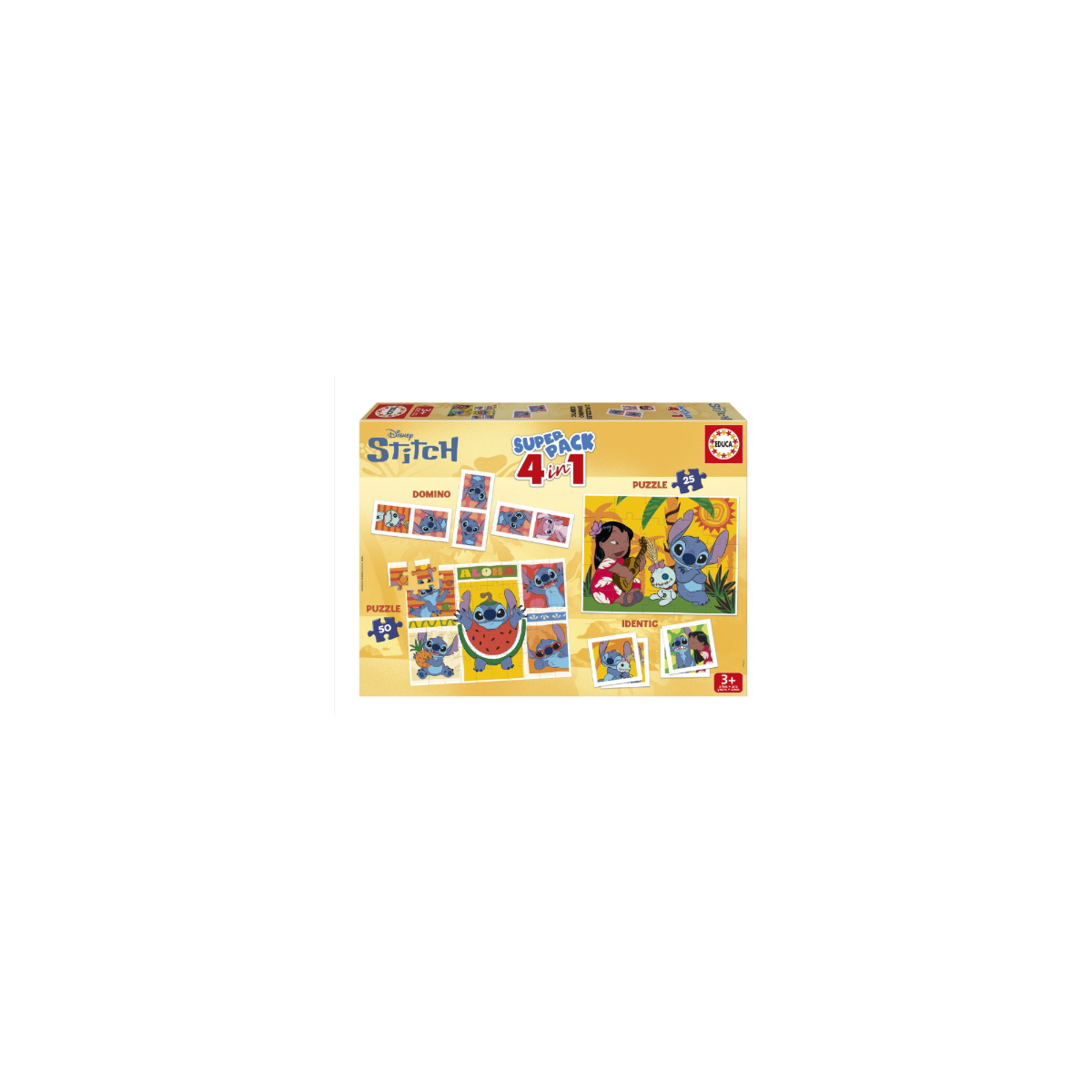 El pack combina puzzles progresivos, dominó y juego de identificación (memory), ofreciendo distintas formas de juego que ayudan a desarrollar la memoria, la atención y la lógica. Sus piezas son resistentes, de fácil manejo y con ilustraciones coloridas de Stitch que encantan desde el primer momento.