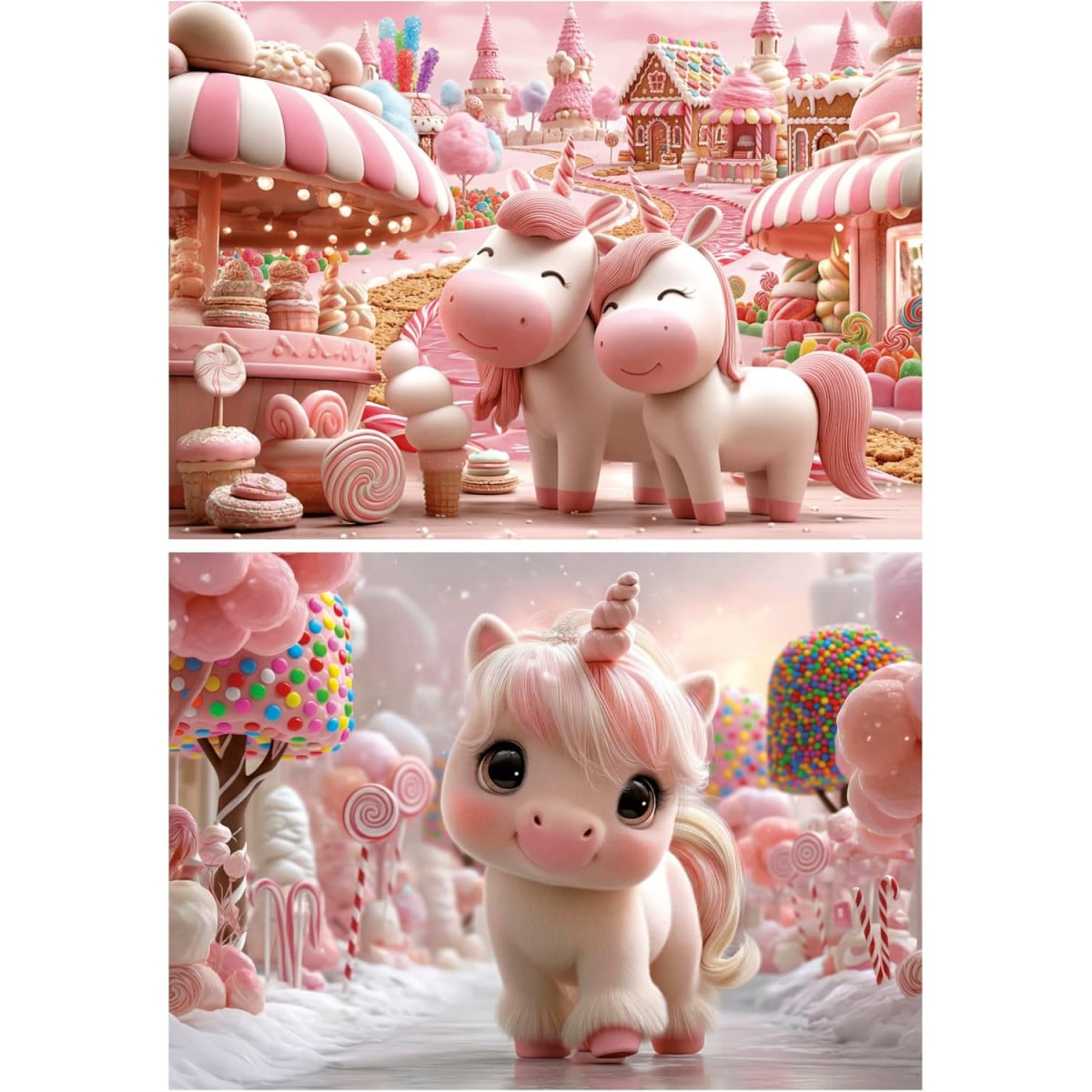 El Puzzle Unicornios Dulces destaca por su estética mágica y llena de fantasía, con ilustraciones que parecen sacadas de un mundo de ensueño. Este set incluye dos escenas diferentes protagonizadas por adorables unicornios en un entorno repleto de dulces, colores pastel y detalles encantadores.