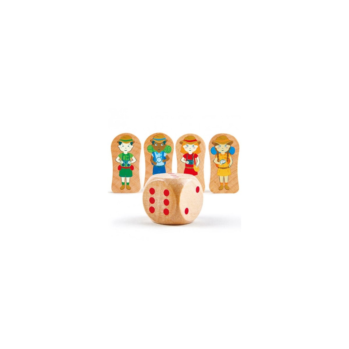 Incluye un póster de doble cara, 100 piezas, 4 personajes de madera y 1 dado.
