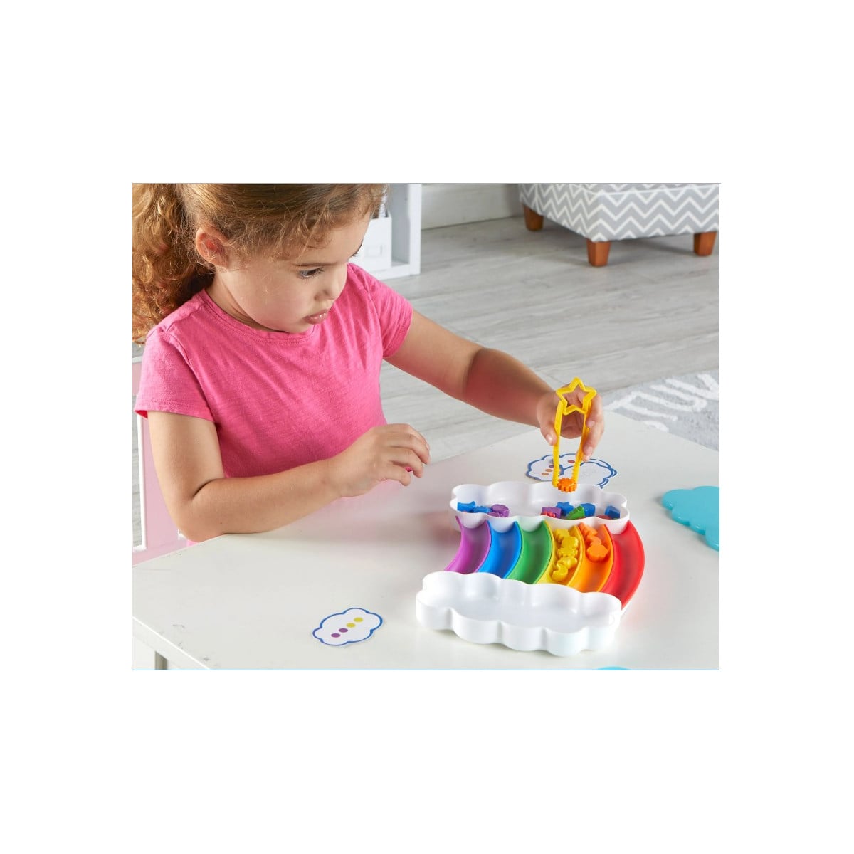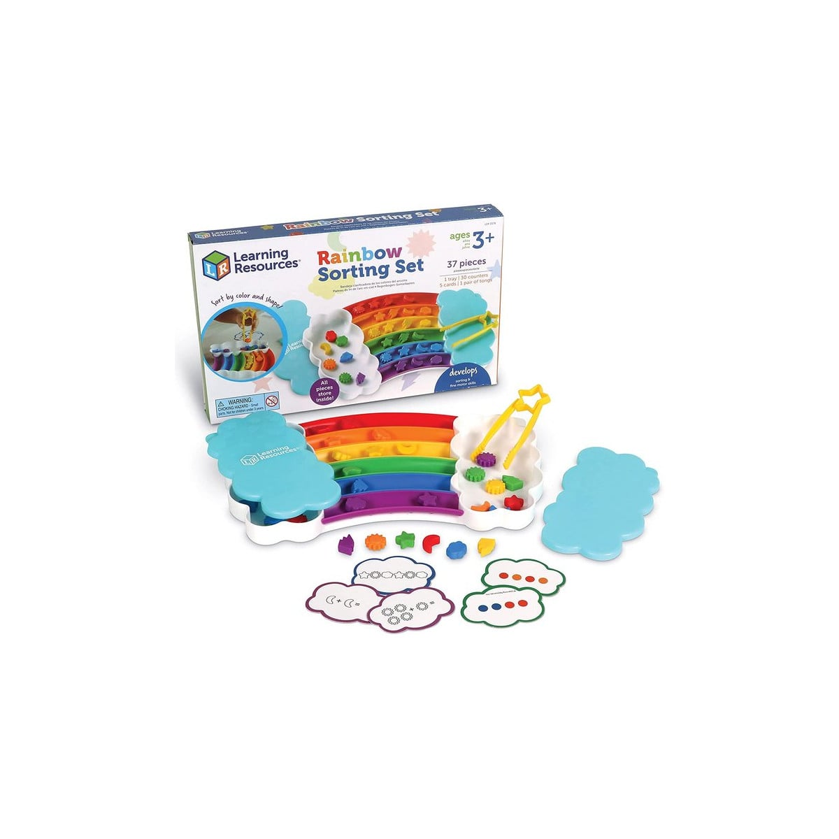 - Incluye: 37 piezas (1 bandeja con forma de arcoiris, 30 cuentas, 5 tarjetas y unas pinzas)