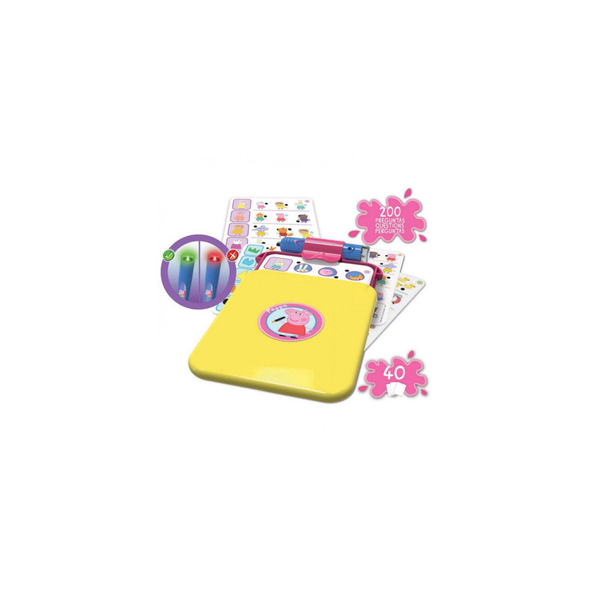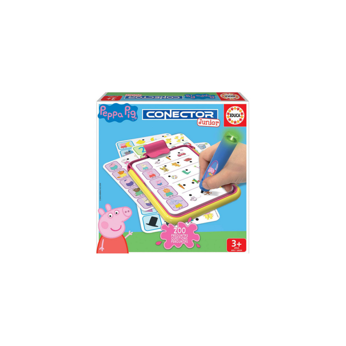 - Incluye: 1 juegos educativo de Peppa Pig Conector Junior con 40 láminas, 200 preguntas, 1 boli con LED y 1 base multiconectora con tapa