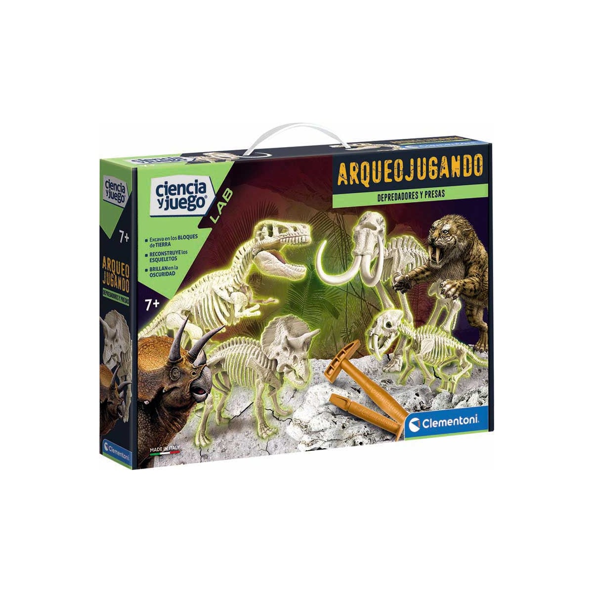 El kit "Arqueojugando Depredadores y Presas" es una fascinante aventura educativa que transporta a los niños y niñas al mundo de la paleontología. Este juego permite a los pequeños convertirse en auténticos paleontólogos, excavando y descubriendo los secretos de criaturas prehistóricas. Con herramientas incluidas, los niños y niñas pueden excavar en bloques de tierra para desenterrar y reconstruir los esqueletos fosforescentes de dos dinosaurios emblemáticos: el temible T-Rex y el robusto Triceratops, así como de dos mamíferos prehistóricos: el majestuoso Mamut y el ágil Smilodon. Una vez ensamblados, estos esqueletos brillan en la oscuridad, añadiendo un toque mágico a la experiencia. Además de la diversión, este kit educativo fomenta el aprendizaje sobre la era prehistórica, desarrollando habilidades motoras finas y promoviendo la paciencia y la atención al detalle. Es una excelente manera de combinar entretenimiento y educación, despertando la curiosidad científica en los niños y niñas.