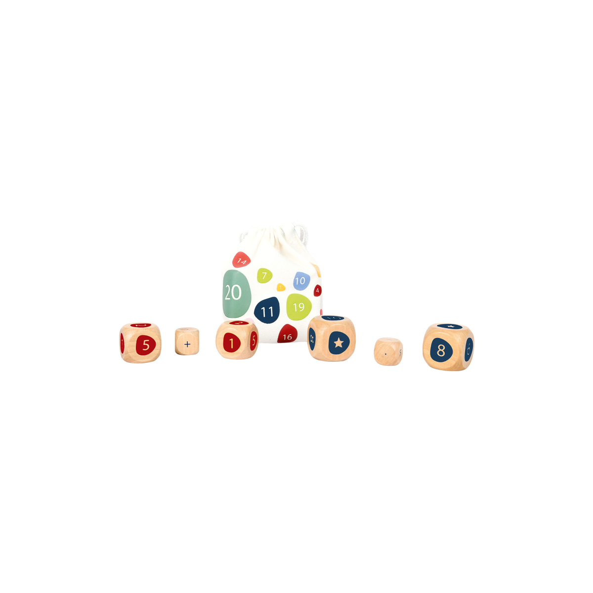 El set incluye 6 dados de madera, con números y símbolos que permiten realizar desde sumas y restas hasta multiplicaciones y divisiones, adaptándose al nivel de cada niño o niña.
