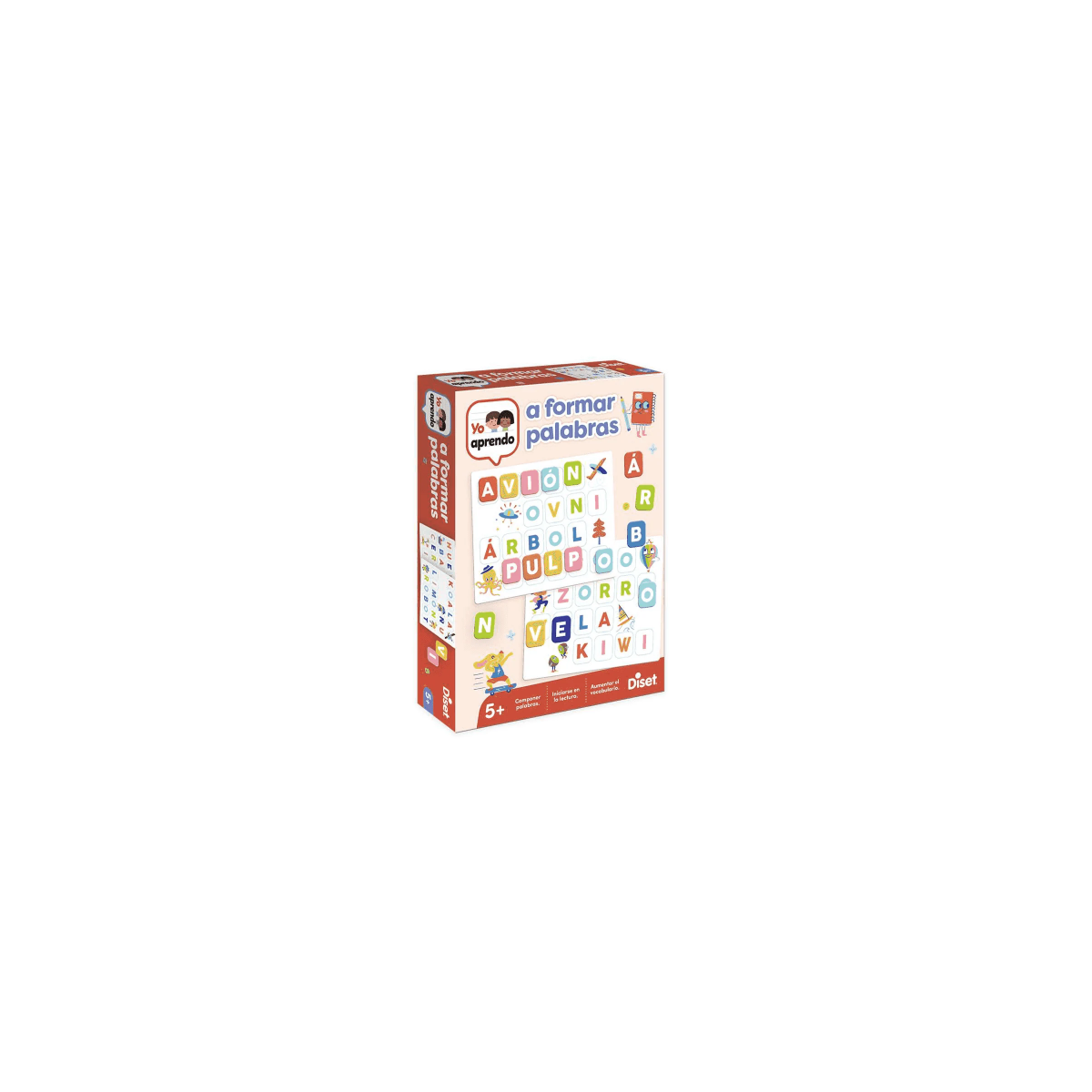 Juego educativo para aprender a formar palabras con letras y tableros, ideal para iniciar la lectura y mejorar vocabulario desde los 5 años.