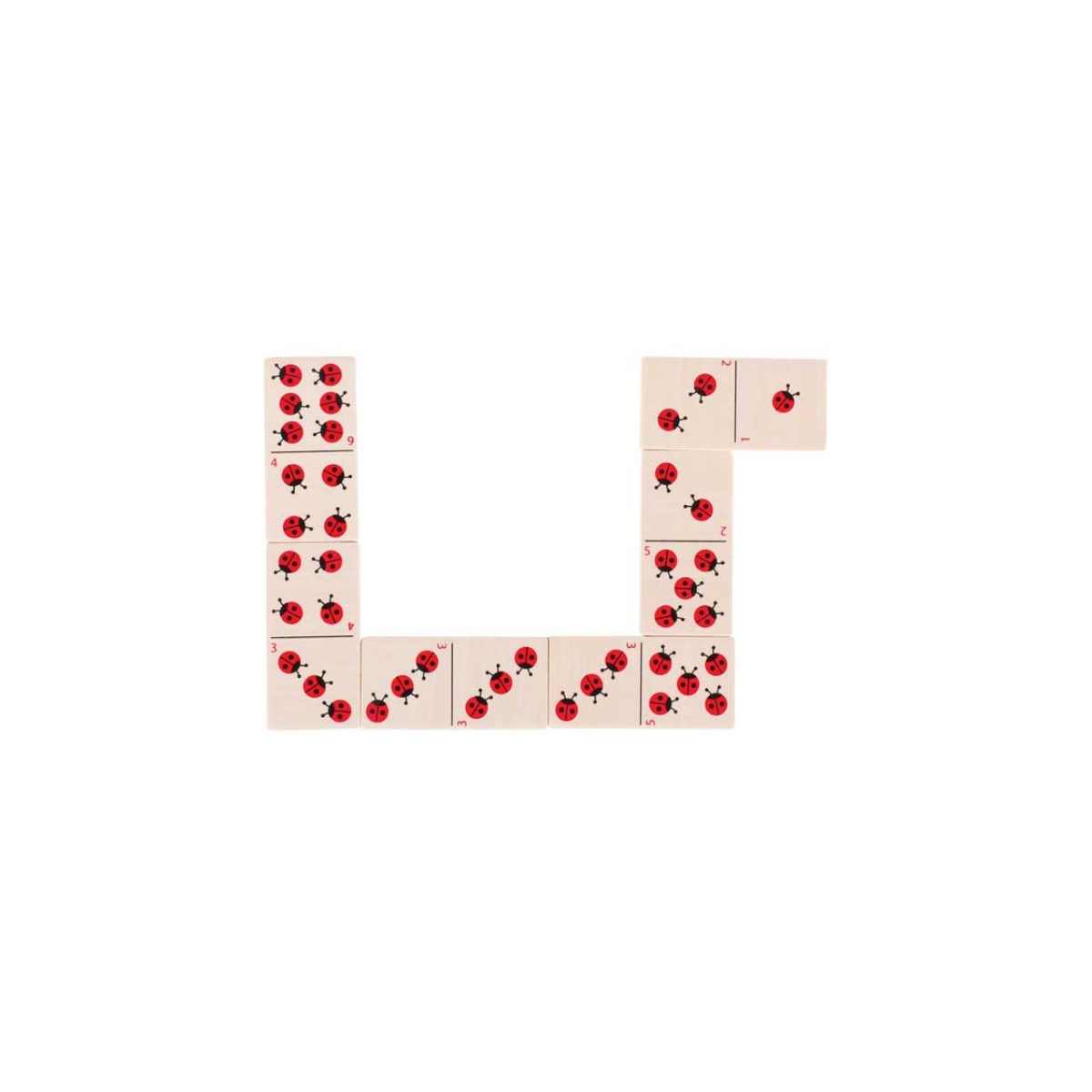 - Dominó infantil con fichas de madera ilustradas con mariquitas.