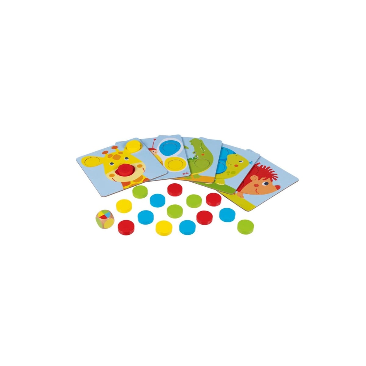 El juego incluye fichas redondas de colores (rojo, azul, verde y amarillo), un dado de colores y tarjetas con ilustraciones de animales. El objetivo es lanzar el dado y colocar las fichas en el lugar correcto según el color que haya salido, completando cada dibujo de forma coherente. Este sencillo mecanismo ayuda a desarrollar habilidades de observación, reconocimiento visual y coordinación mano-ojo.
