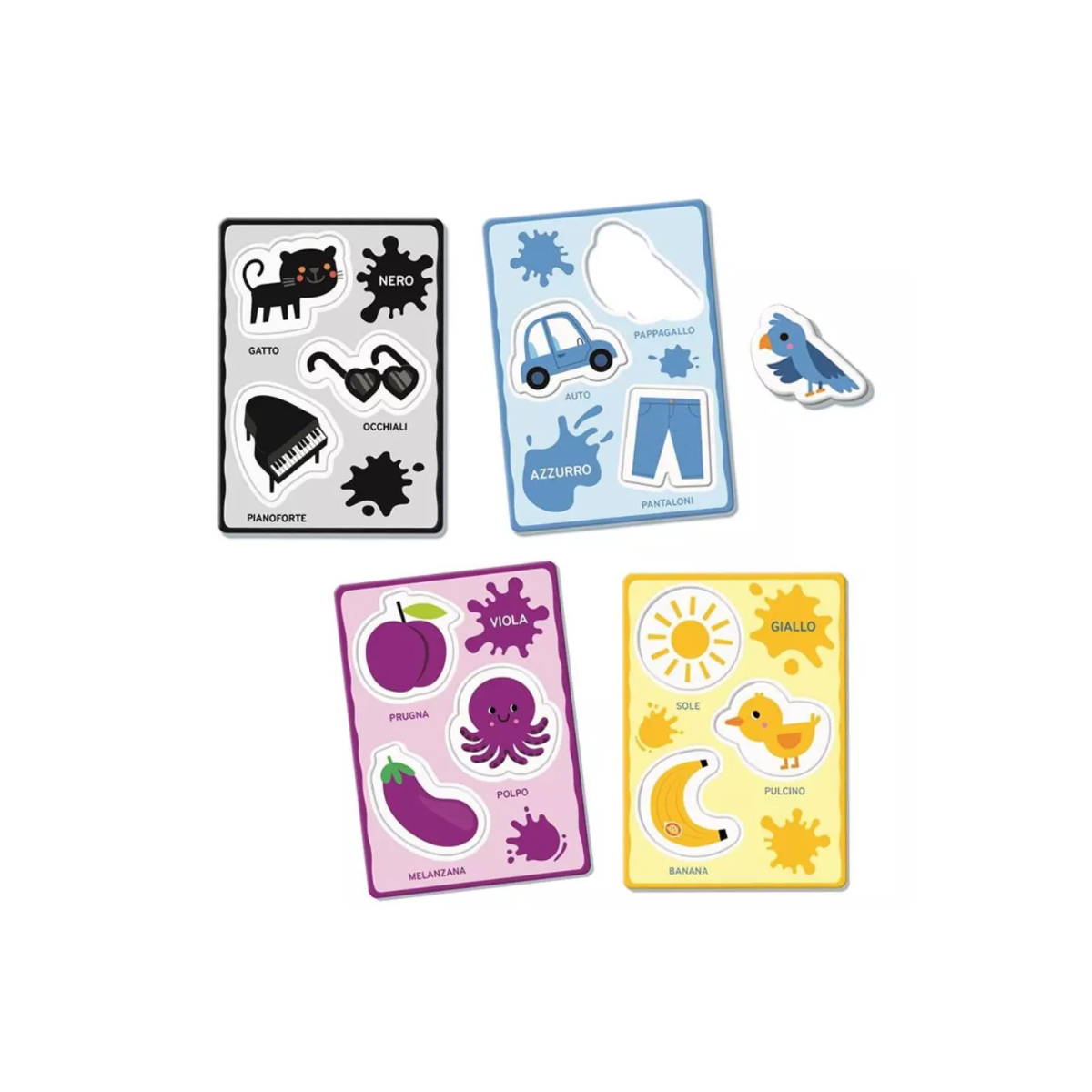El juego incluye figuras troqueladas y láminas temáticas, donde los peques encajan cada elemento según su color, facilitando la comprensión de colores de manera intuitiva y divertida.