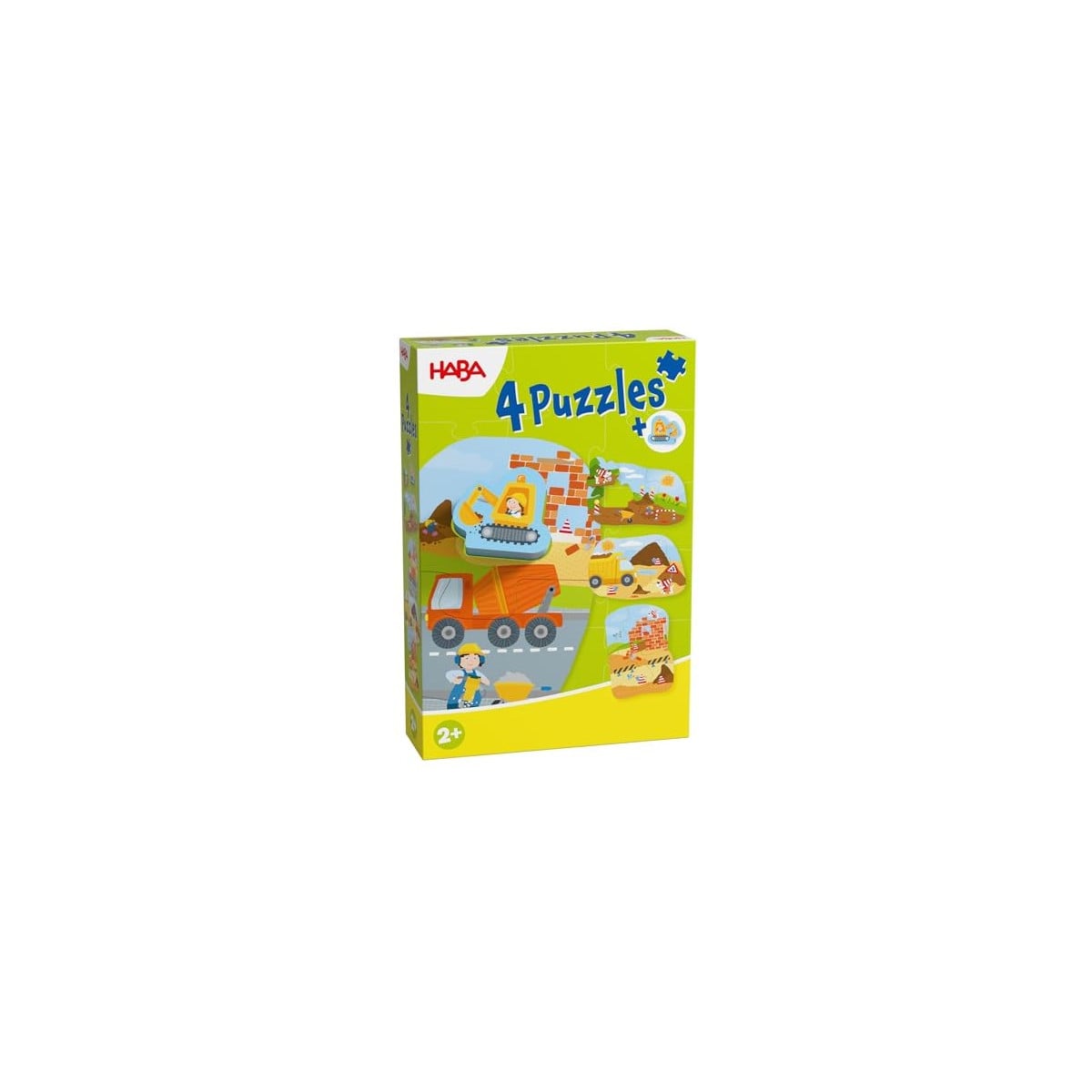 Set HABA con 4 primeros puzzles de temática obra y maquinaria. Piezas grandes y resistentes pensadas para manos pequeñas que ayudan a desarrollar la motricidad fina jugando.