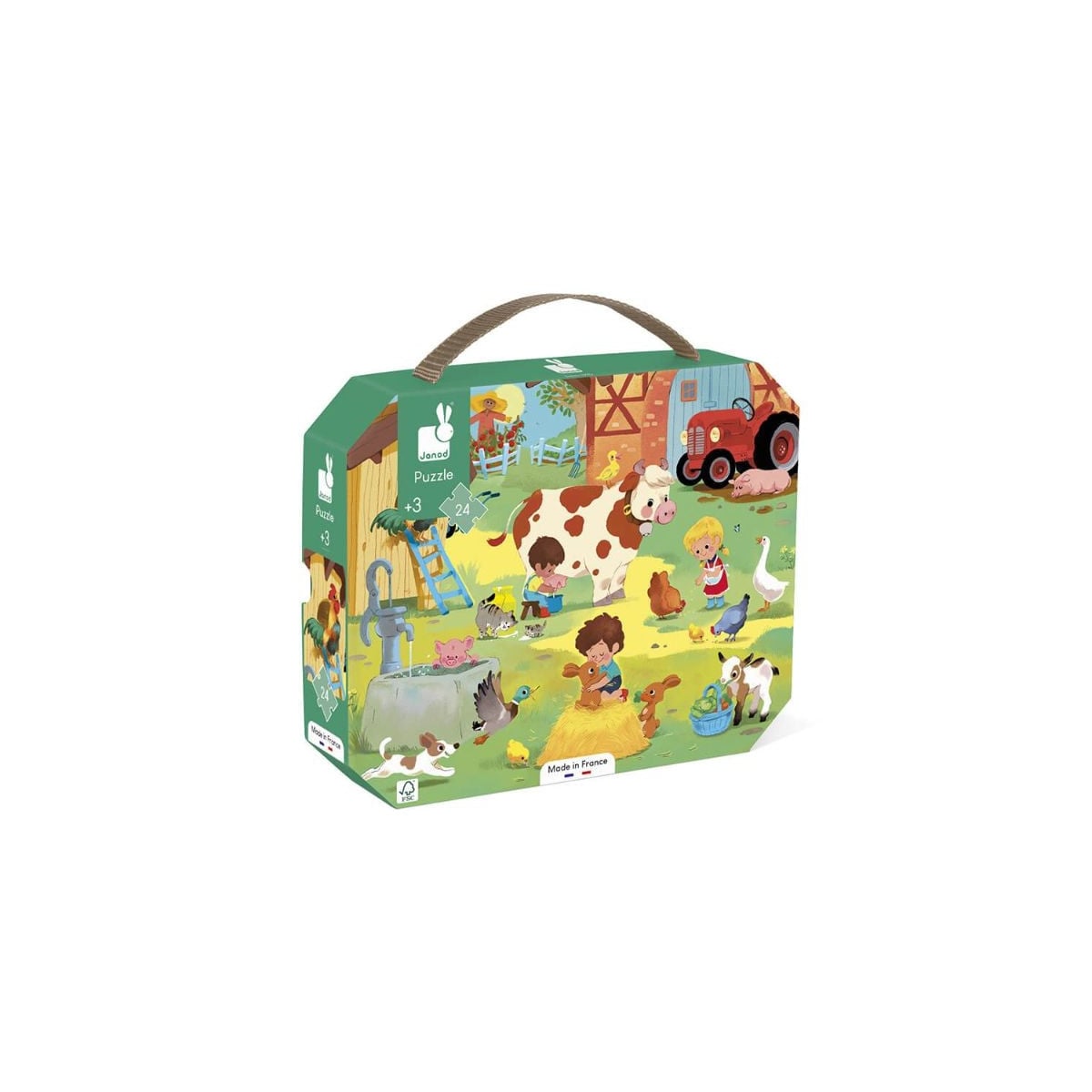 Sus piezas están diseñadas para manos pequeñas, facilitando el encaje y ayudando a desarrollar la coordinación mano-ojo, la concentración y la paciencia. Además, al completar la escena, los peques podrán reconocer distintos animales y elementos del entorno rural, fomentando la curiosidad y el lenguaje. Su práctico formato con maletita hace que sea perfecto para guardar y transportar cómodamente.