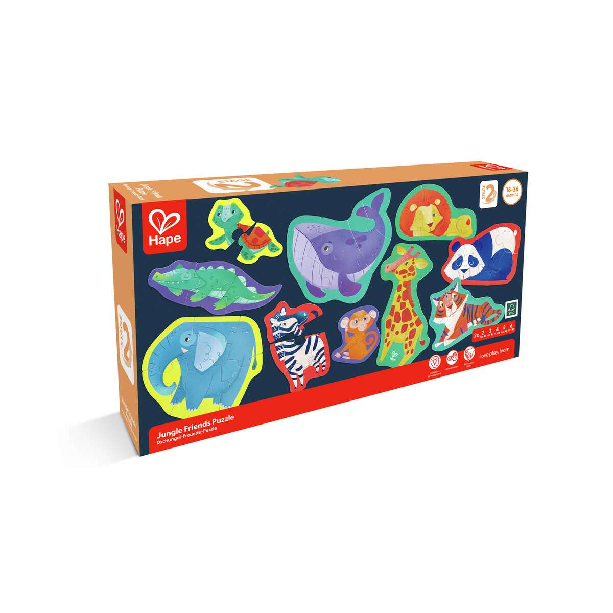 Sumérgete en un emocionante viaje a la selva con el puzle rompecabezas Amigos de la Jungla de Hape. Diseñado con amor y cuidado, este cautivador rompecabezas no solo promete horas de entretenimiento, sino que también ofrece valiosas oportunidades de aprendizaje para niños de todas las edades.