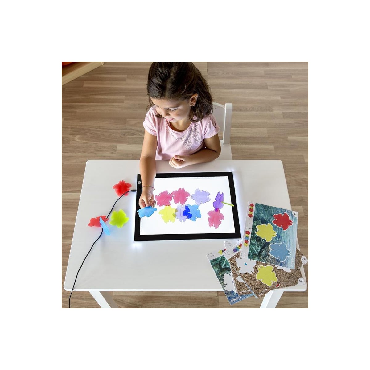 20 Tortugas Translúcidas: Cada tortuga es transparente y viene en 4 colores diferentes. Los niños pueden manipularlas, apilarlas y explorar sus formas y colores. Estas tortugas son ideales para el juego en mesas de luz.