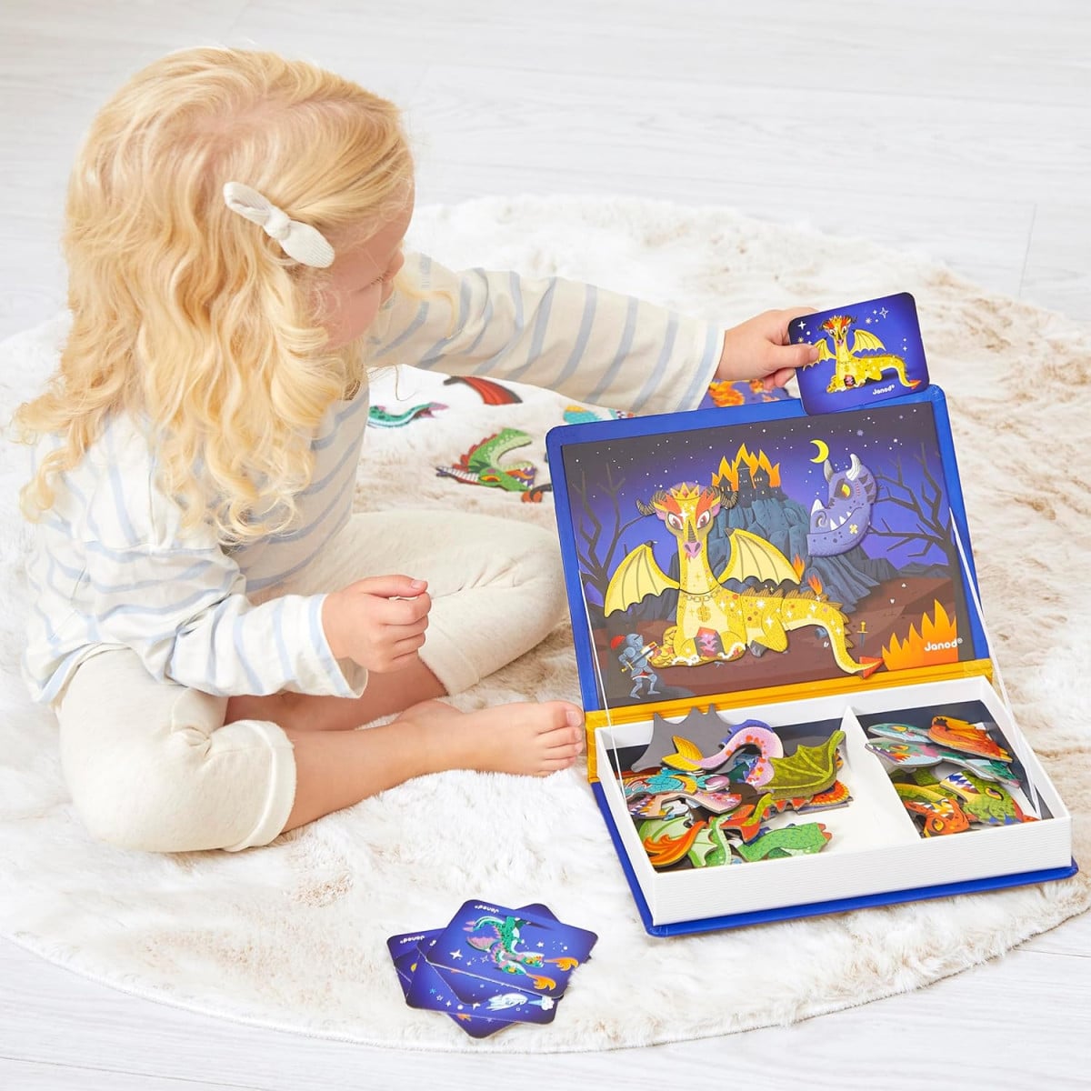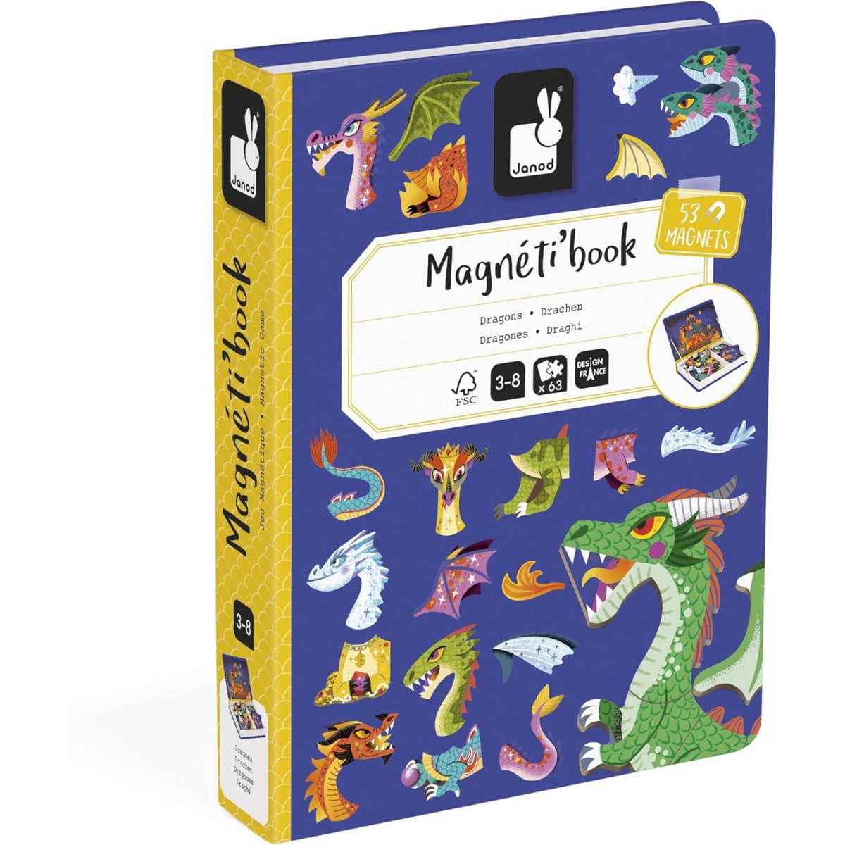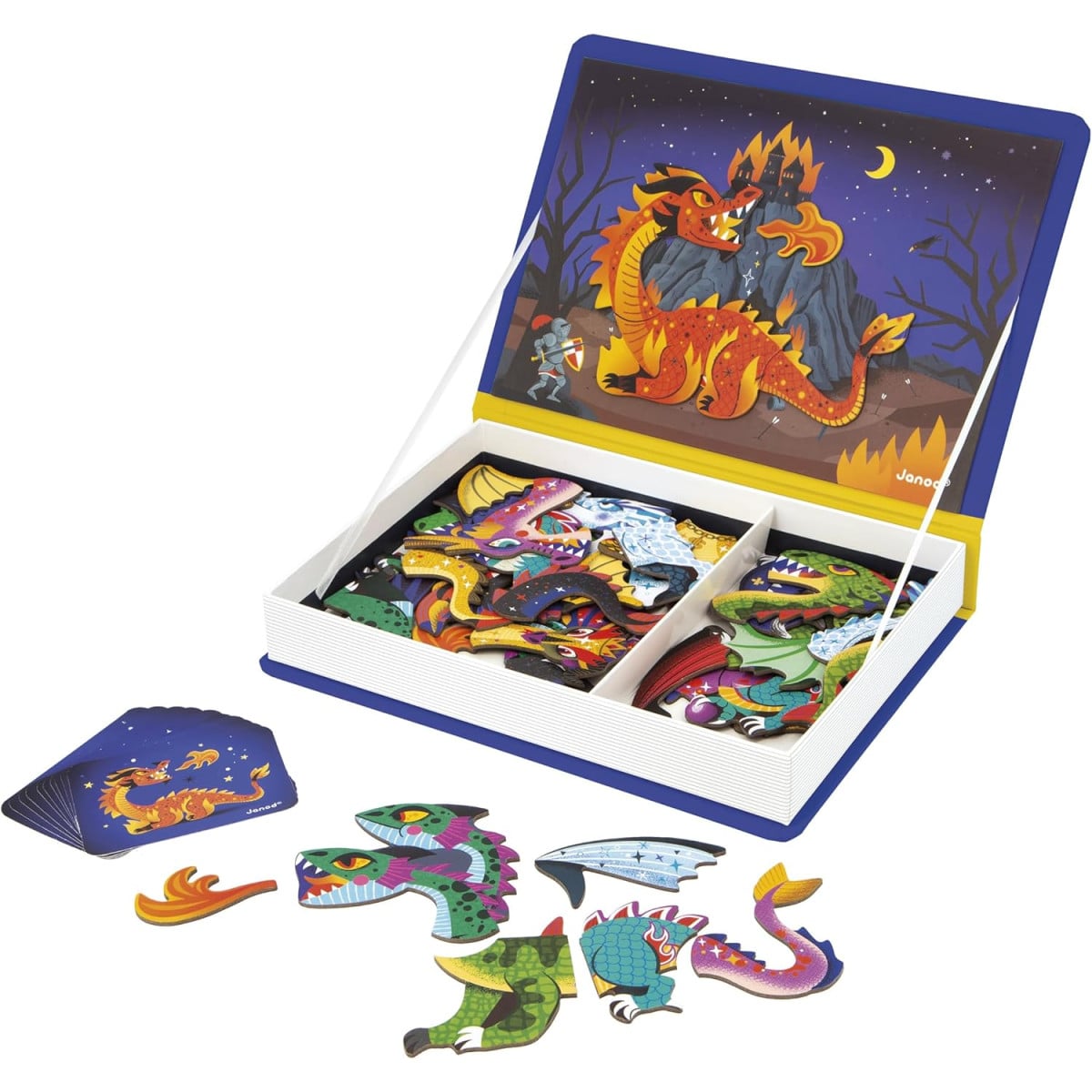 Magnetibook Dragones Janod con 53 imanes y modelos. Juego creativo para diseñar criaturas fantásticas. Compacto y perfecto para llevar de viaje.