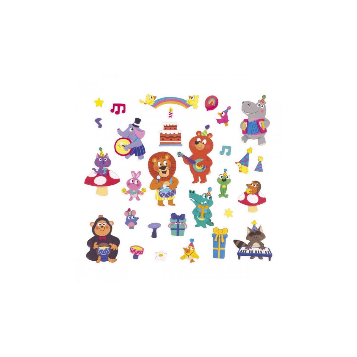 - Contenido: Incluye diferentes piezas magnéticas con ilustraciones de animales y elementos de una fiesta (decoraciones, accesorios, etc.) que pueden ser combinadas y reorganizadas de diversas formas.