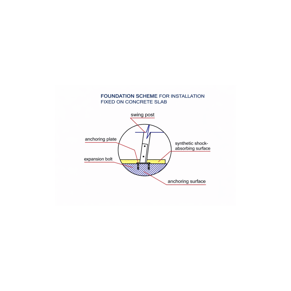 Esquema de cómo son los anclajes cuando se piden para atornillar el parque encima de una solera de hormigón. Deben tener en cuenta que deberían poner caucho en formato loseta o pavimento continuo de 40 mm de grosor en toda el área de seguridad de cada parque.