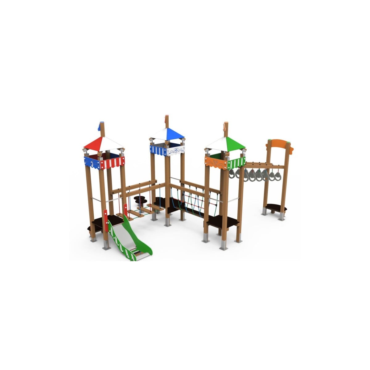 El parque dispone de tres torres situadas al mismo nivel, con plataformas a 60 cm del suelo. El recorrido comienza con una pasarela doble de anillas que conduce a la primera torre. Desde allí, los niños deberán atravesar diferentes elementos de equilibrio y salto hasta llegar a la última torre, donde podrán finalizar la aventura deslizándose por un pequeño tobogán.