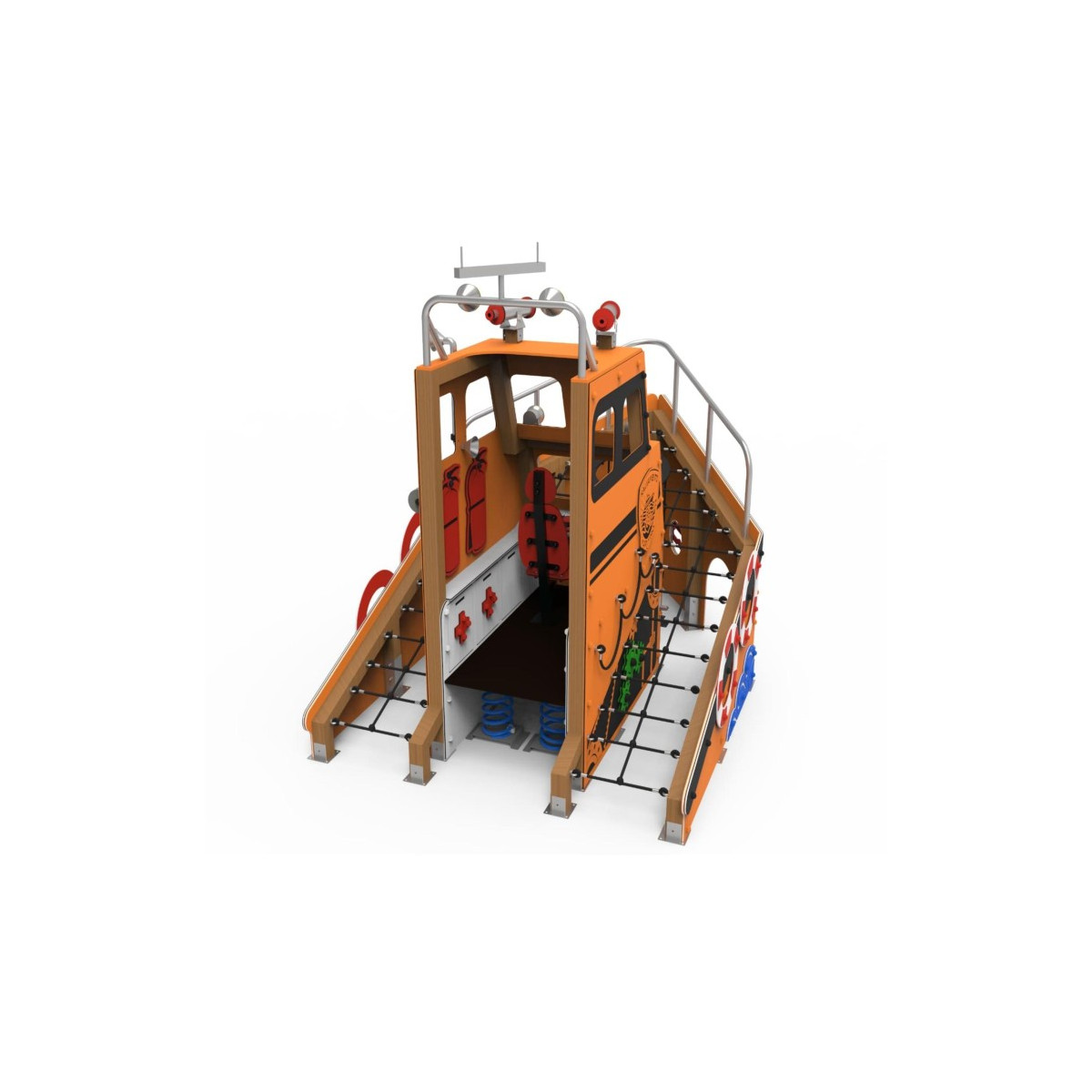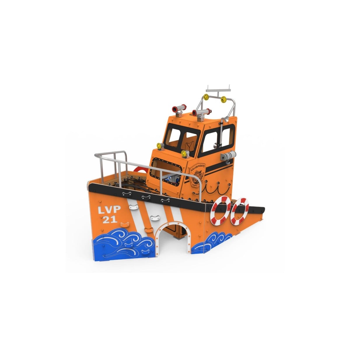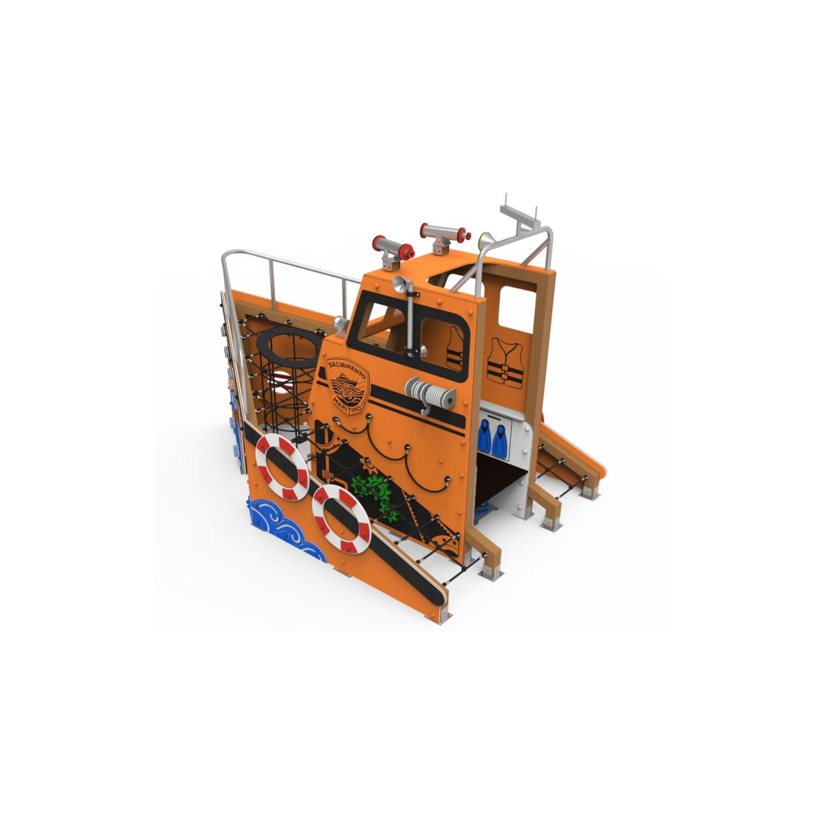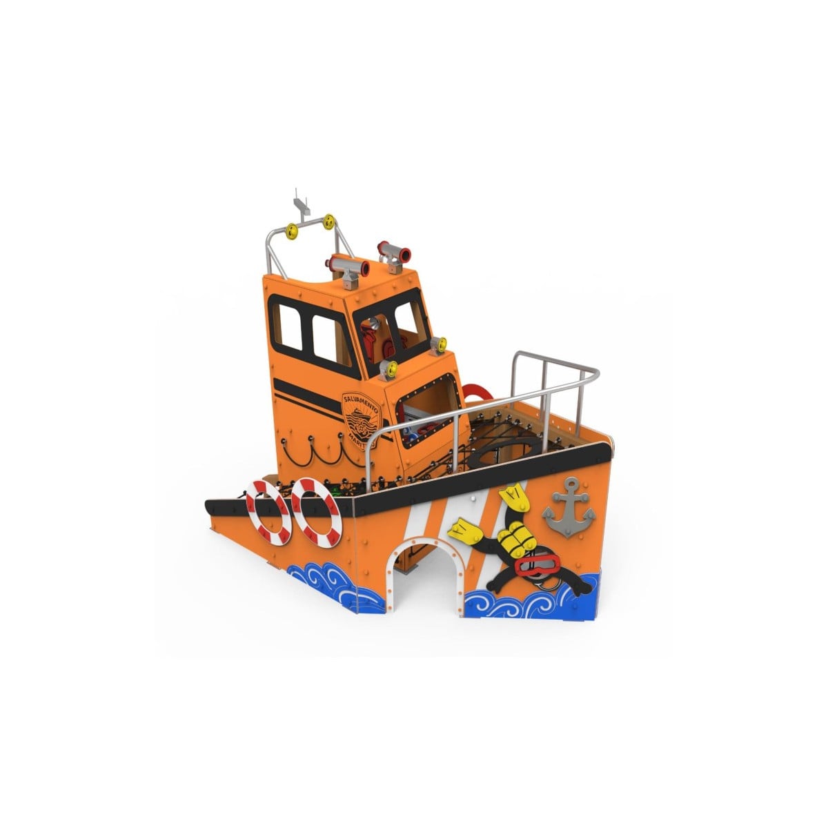 Los niños pueden entrar en la cabina de la embarcación y sentarse como si estuvieran pilotando su propio barco. Al mismo tiempo, pueden recorrer el exterior mediante redes de trepa, estimulando la coordinación, la motricidad y el juego activo. Cada niño puede inventar su propia historia: expediciones submarinas, búsquedas de tesoros o misiones de rescate.