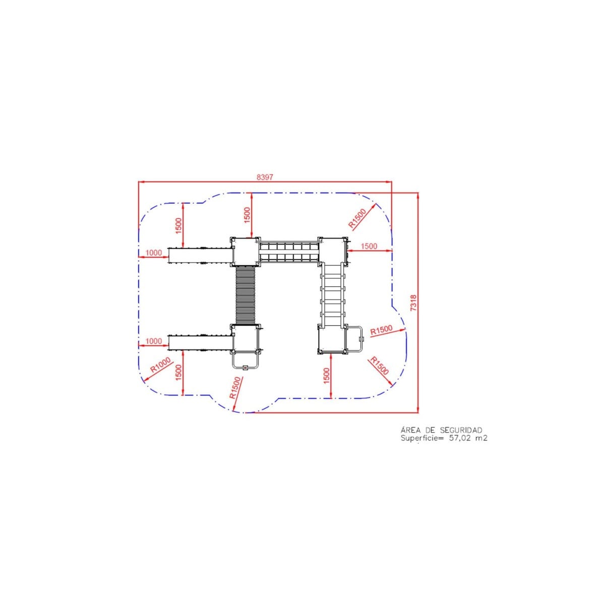 El parque infantil Mundial requiere un área de seguridad de 61,33 m² o un espacio rectangular de 8,39 m x 7,31 m.