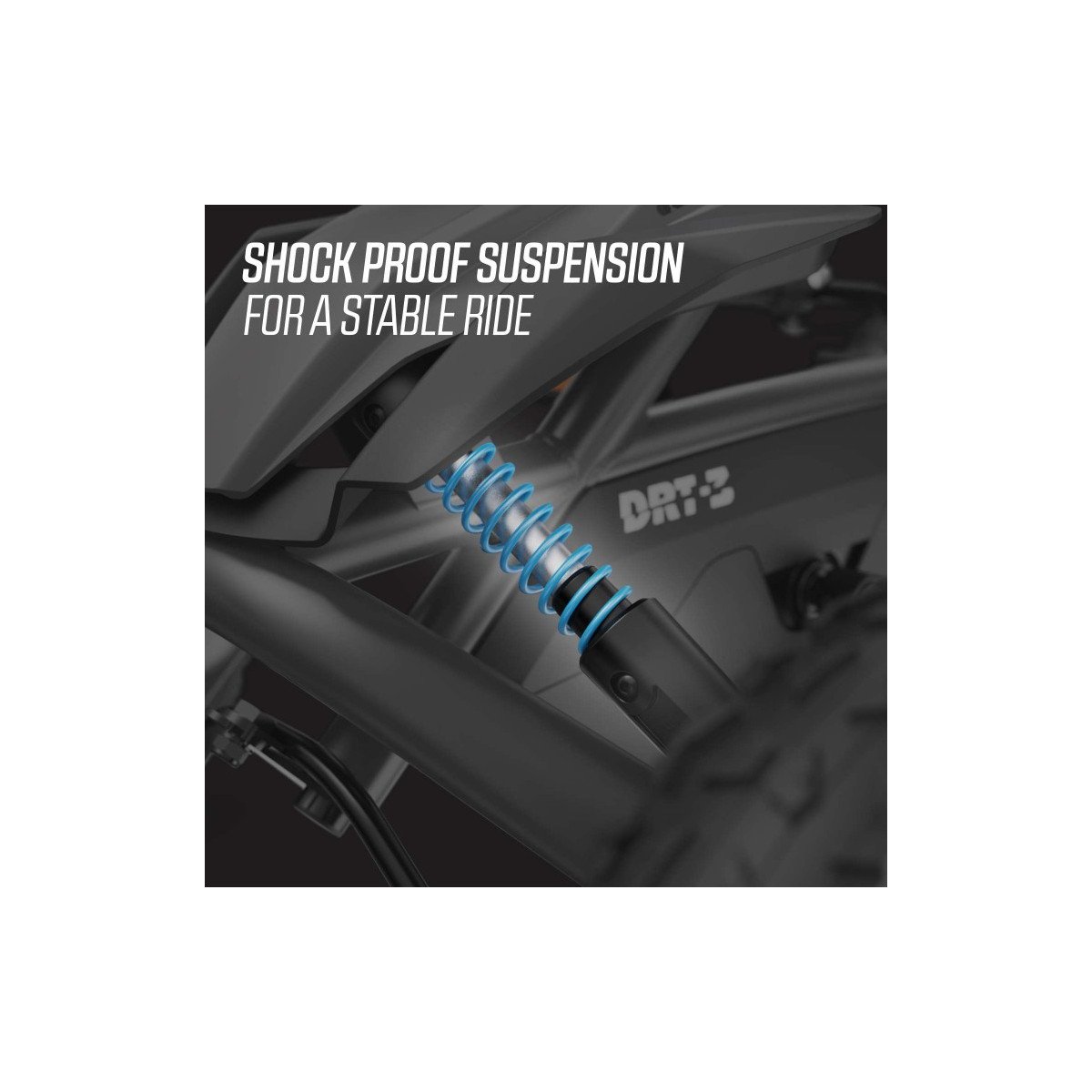 Este coche de pedales está equipado con suspensión delantera para absorber los baches y proporcionar mayor confort en caminos irregulares. Sus neumáticos off-road garantizan un buen agarre en pistas de tierra y senderos al aire libre.