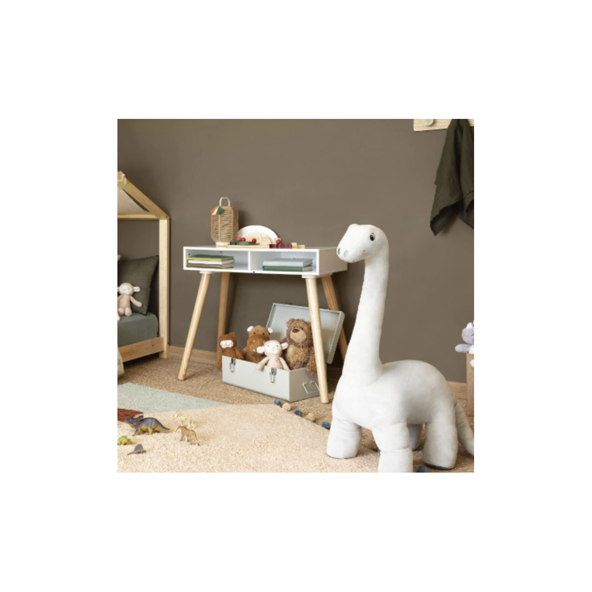 El Peluche Dino Elio es una pieza que destaca desde el primer vistazo por su tamaño generoso y su presencia acogedora. Su forma de dinosaurio invita al juego imaginativo, convirtiéndose en protagonista de aventuras, historias y momentos compartidos en el suelo de la habitación o el salón. Gracias a sus dimensiones amplias, permite que niñas y niños se apoyen en él, lo abracen o lo utilicen como respaldo improvisado mientras leen, juegan o descansan. Su color gris aporta un estilo neutro y fácil de integrar en distintos ambientes infantiles.