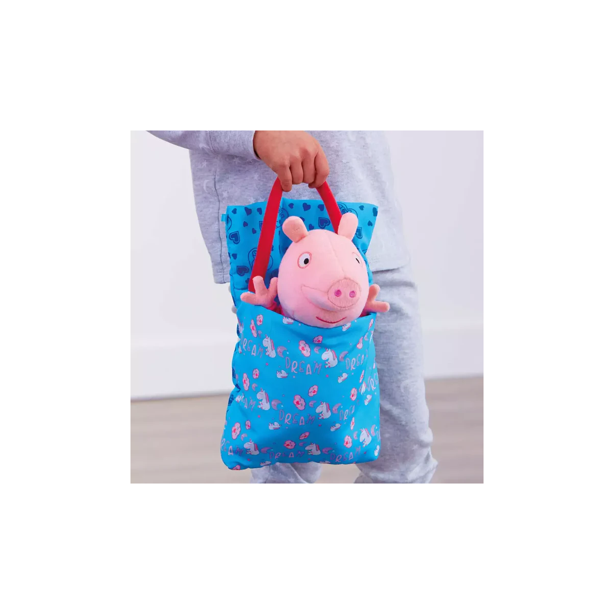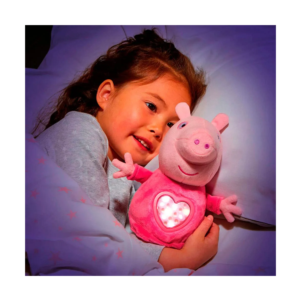 Peppa Pig Fiesta de Pijamas con luz en el corazón, música relajante y saco de dormir. El peluche perfecto para acompañar a niñas y niños al dormir.