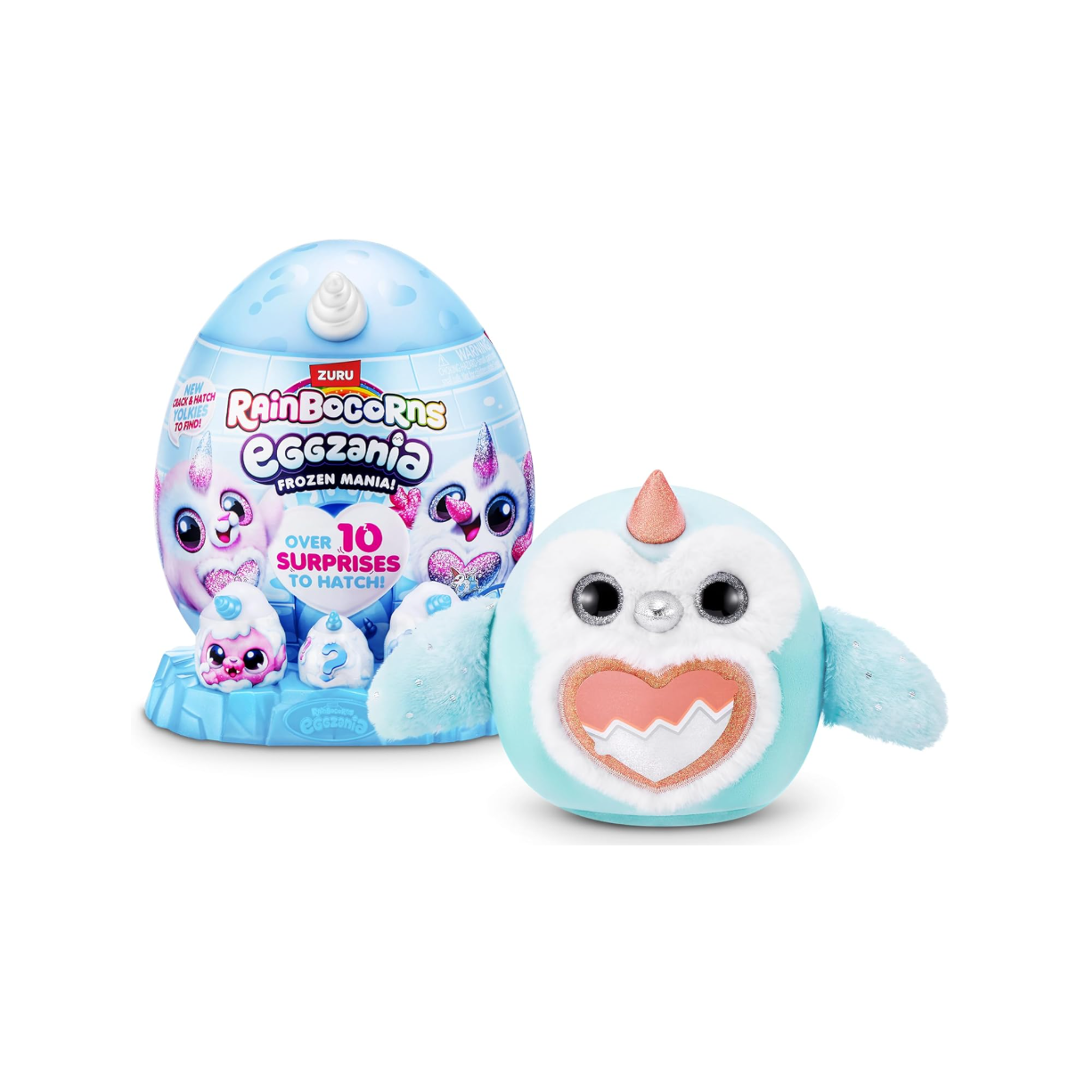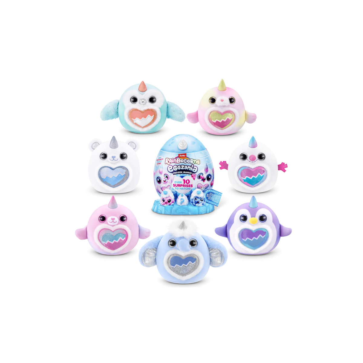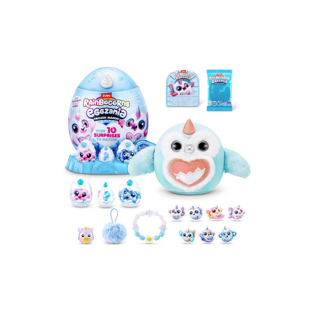Sumérgete en un mundo helado con Rainbocorns Eggzania Frozen Manía: huevos sorpresa de Rainbocorns by ZURU que se incuban con un abrazo para revelar una peluche mágica en cada interior. Entre más de 10 sorpresas ocultas —desde pequeños accesorios hasta pegatinas y slime mini— cada huevo contiene un peluche exclusivo de la colección congelada y una guía coleccionable.