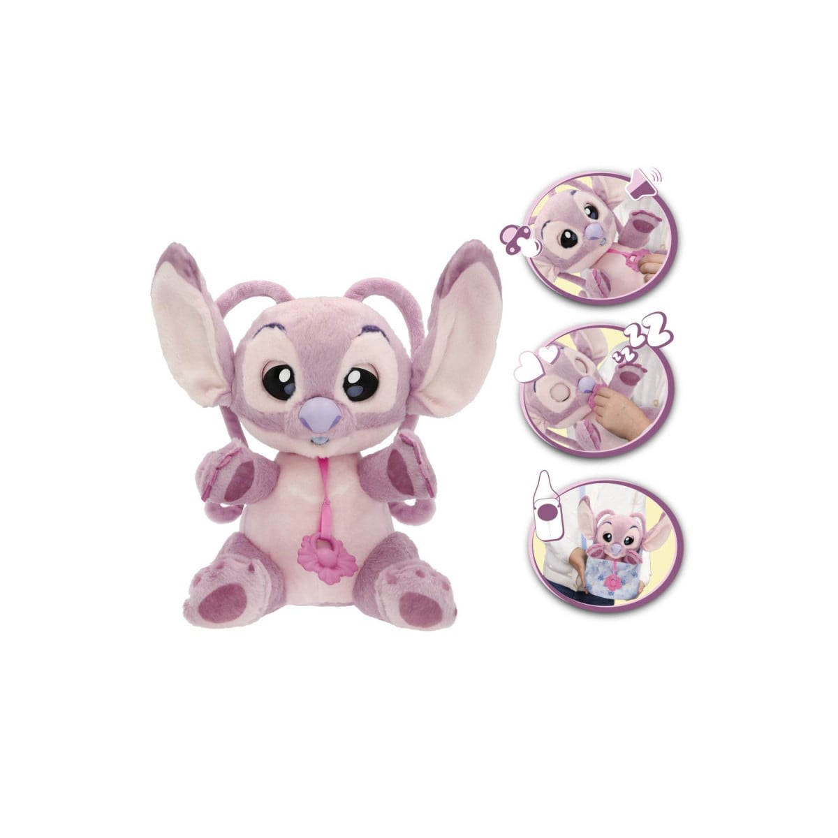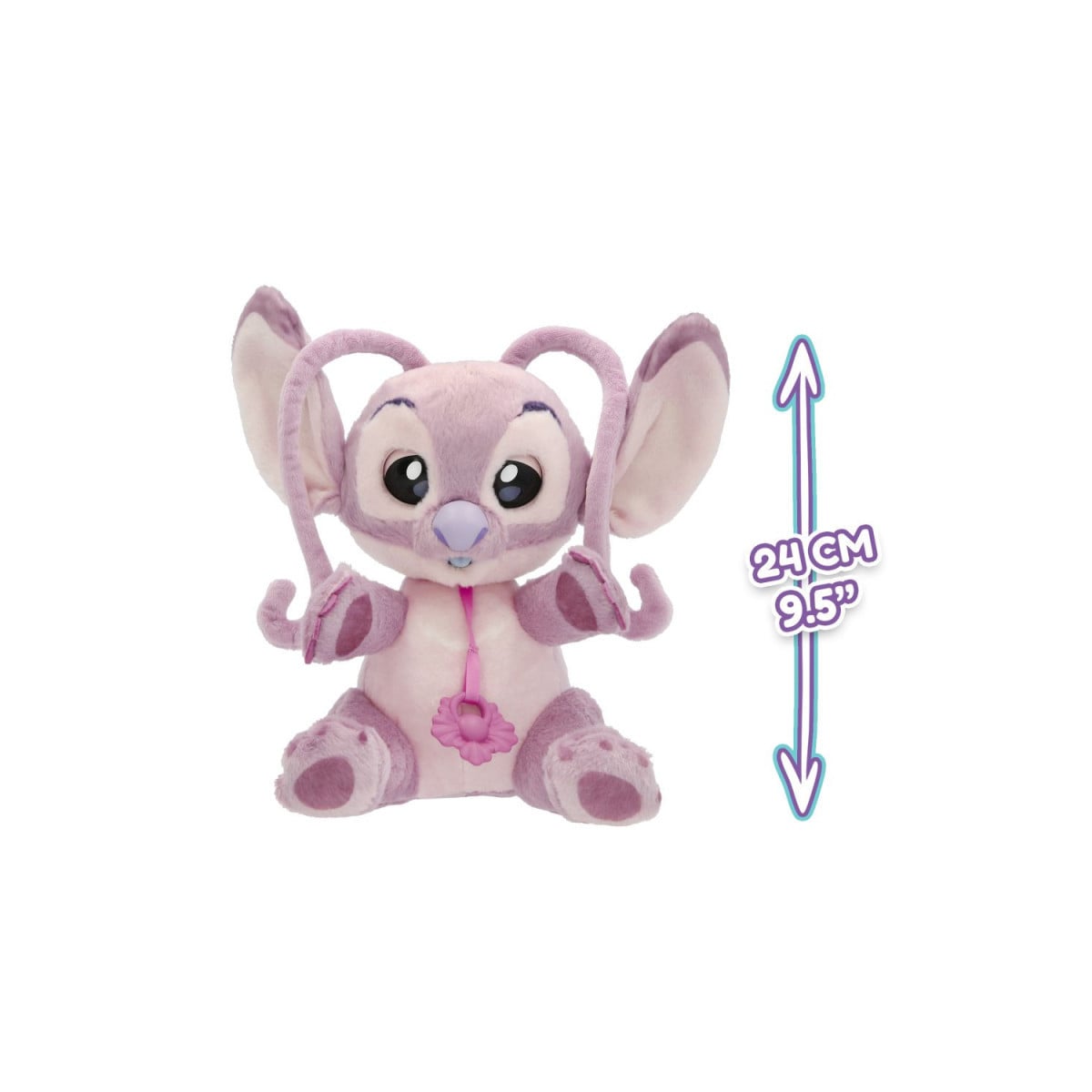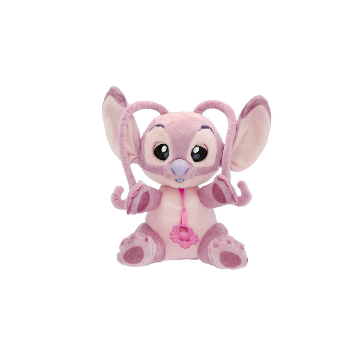 Cuando saques a Angel de su bolsita, descubrirás su cuerpo suave, esponjoso y achuchable, ideal tanto para dormir como para jugar con ella durante el día. La experiencia se completa al devolverle su chupete: se quedará dormida mientras reproduce sonidos adorables que transmiten calma y tranquilidad. Con sus dos accesorios incluidos, su diseño infantil y su funcionamiento sencillo, es un peluche perfecto para las edades más tempranas, pensado para acompañar rutinas, estimular el juego simbólico y aportar compañía cariñosa. Su encanto y suavidad lo convierten en un regalo ideal para quienes adoran el mundo de Lilo & Stitch.