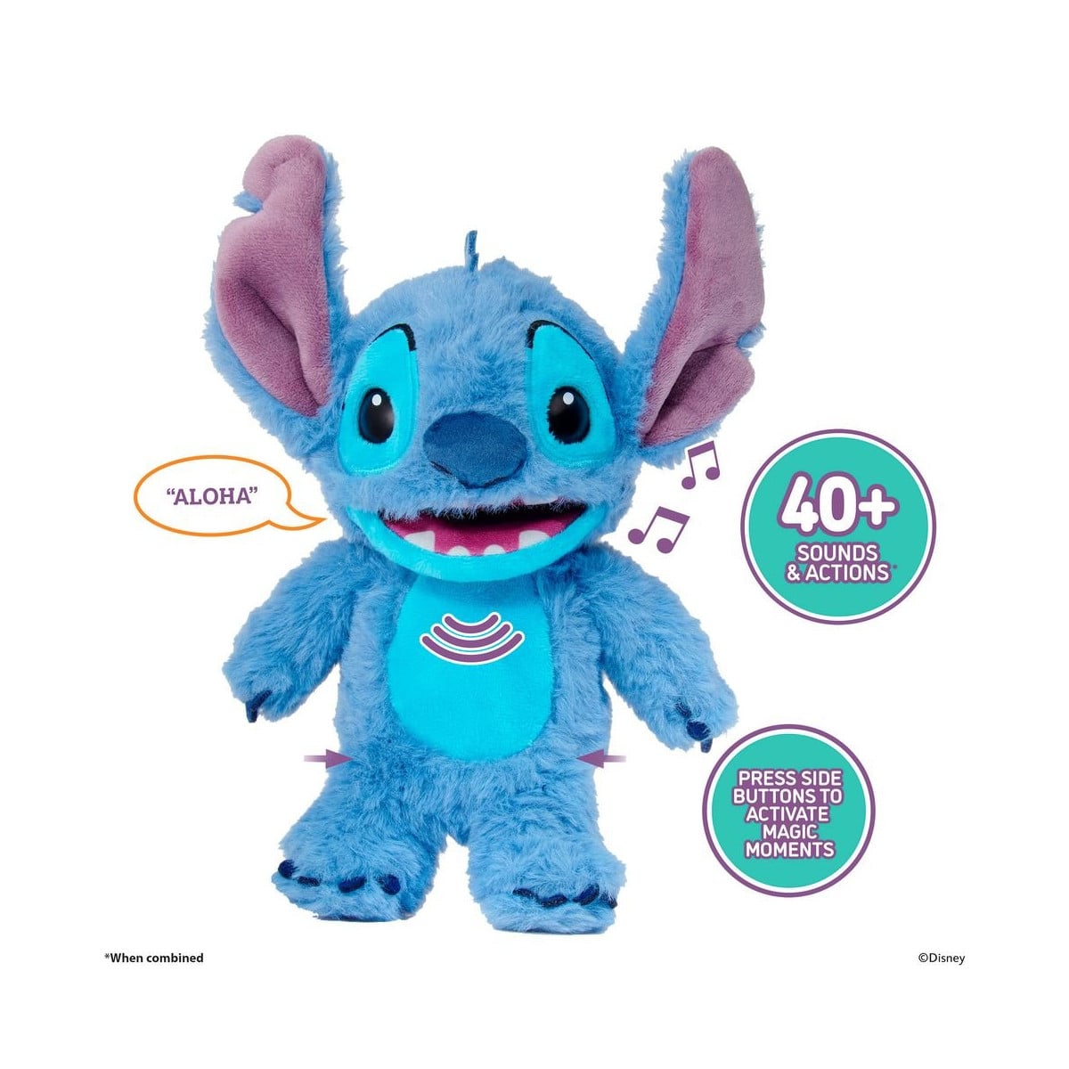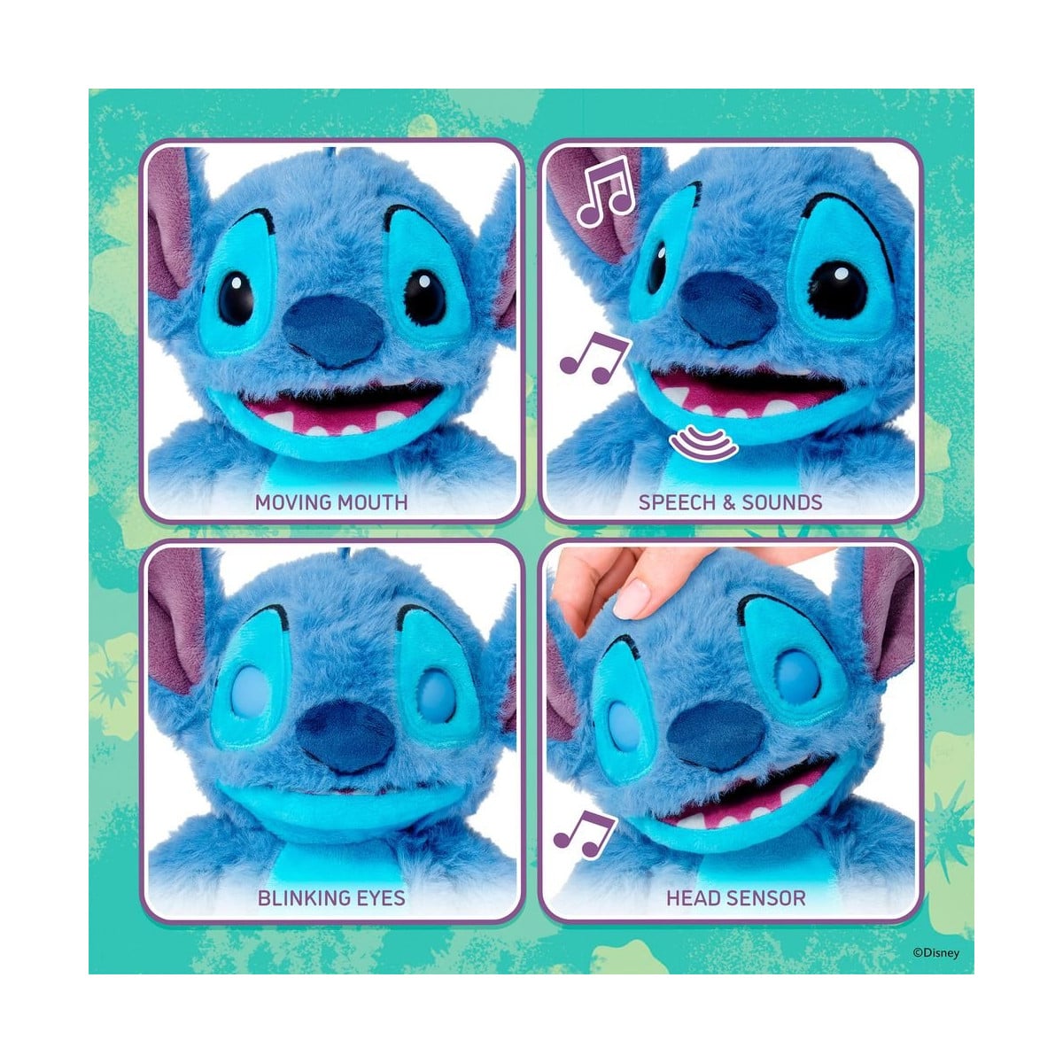 Stitch cuenta con más de 120 sonidos y reacciones que se activan mediante el tacto y el movimiento. Su boca, ojos y orejas se mueven de forma realista, sus ojos parpadean y sus mejillas se iluminan, creando una sensación muy cercana a un personaje “de verdad”.