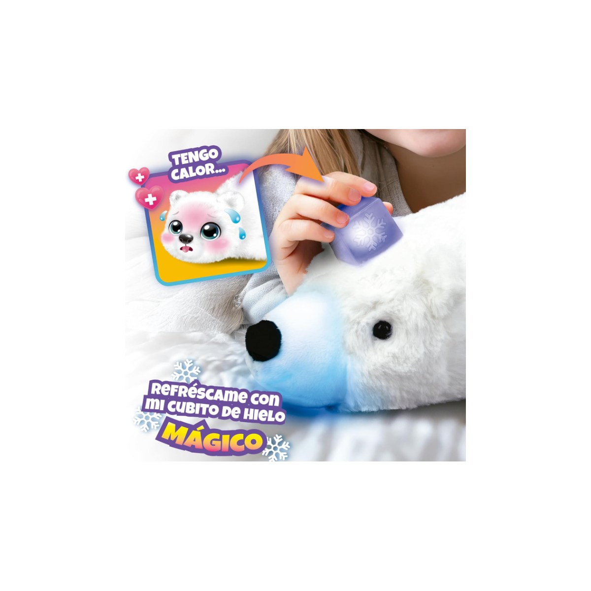 - Actividades: El osito mueve sus ojos y nariz acompañando de luces y sonidos mágicos. Su nariz cambia de color para mostrar como se siente (azul cuando está contento, verde cuando está dormido y rosa cuando tiene demasiada calor). El cubito de hielo mágico incluido sirve para frotar suavemente su cabeza para enfriarlo.