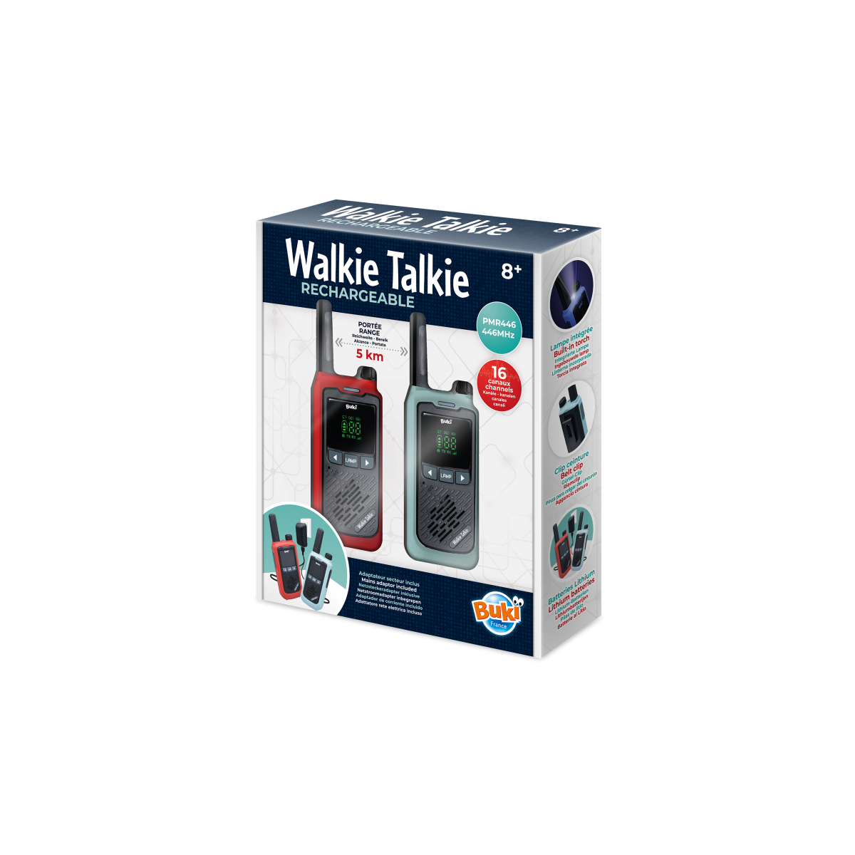 Este set de BUKI está pensado para niñas y niños que disfrutan explorando, organizando misiones de aventura o simplemente manteniéndose conectados entre habitaciones, jardines o parques. Los Walkie Talkie Recargables ofrecen una experiencia real de comunicación, muy sencilla de usar, pero con prestaciones que se sienten “de mayores”. Su diseño resistente, sus botones grandes y su pantalla clara permiten que incluso peques de 8 años puedan utilizarlos sin ayuda, lo que añade autonomía y muchísimo juego cooperativo.
