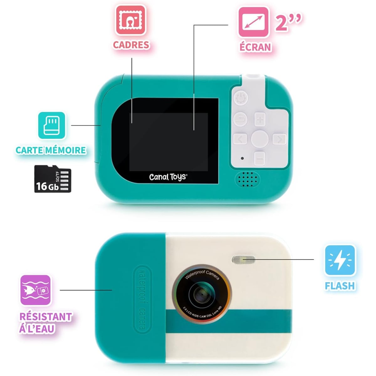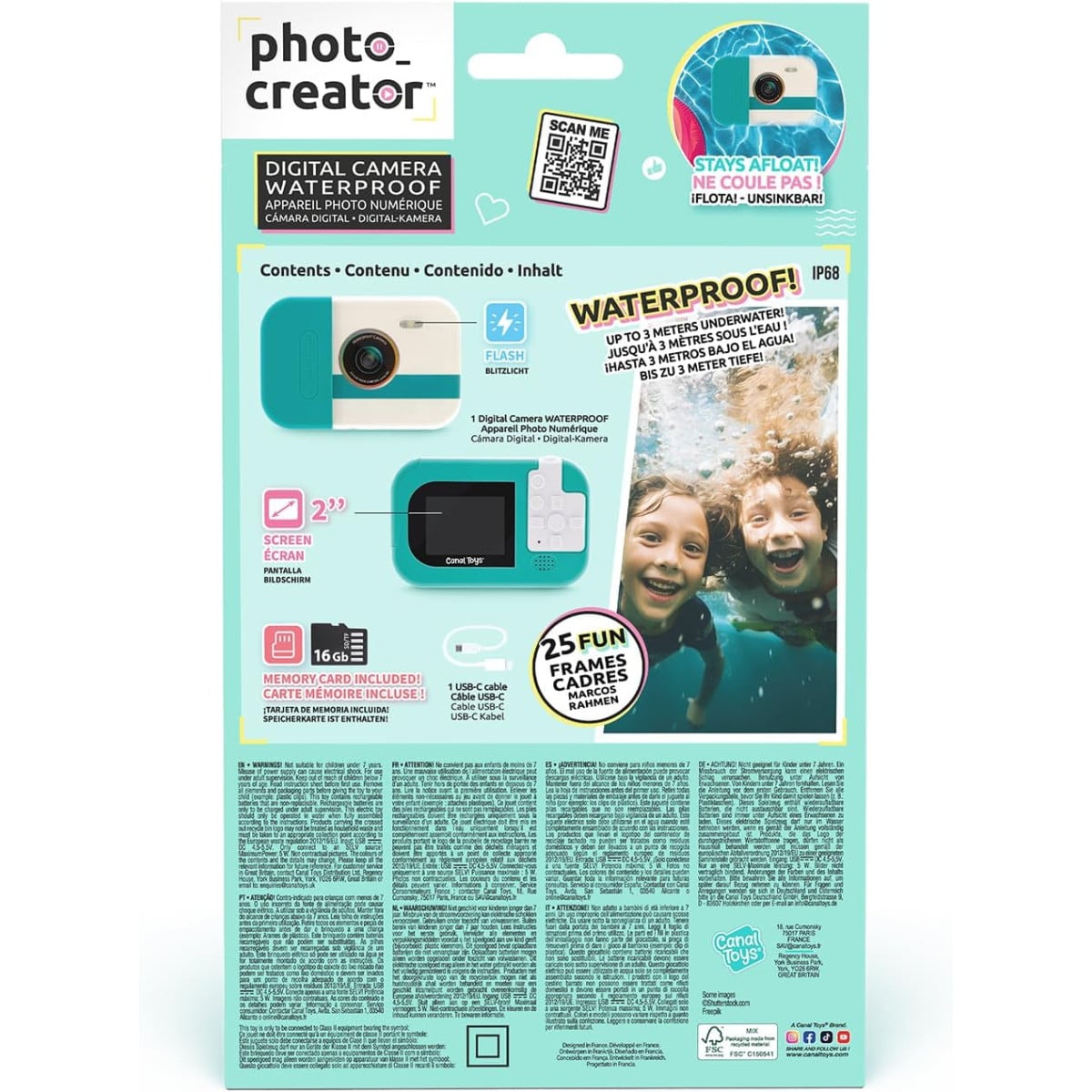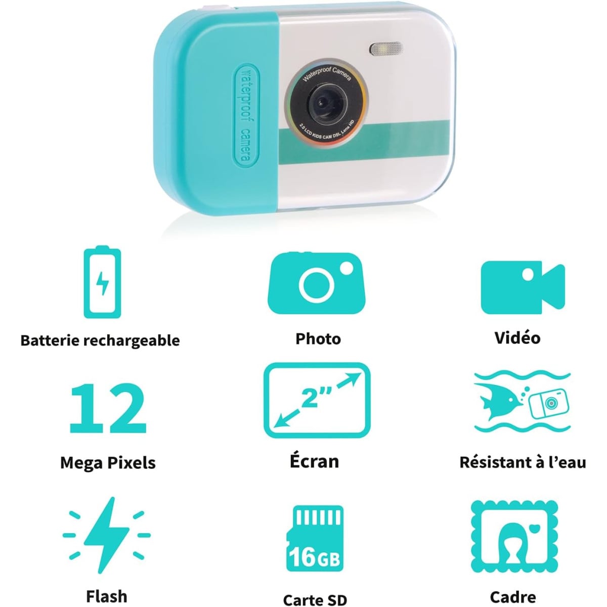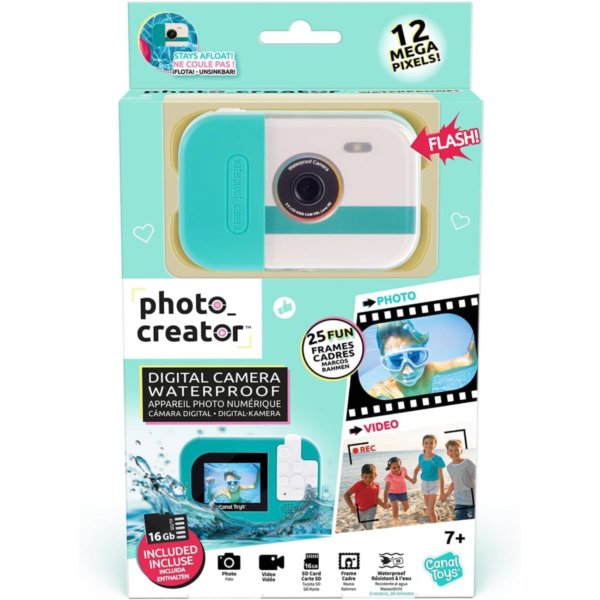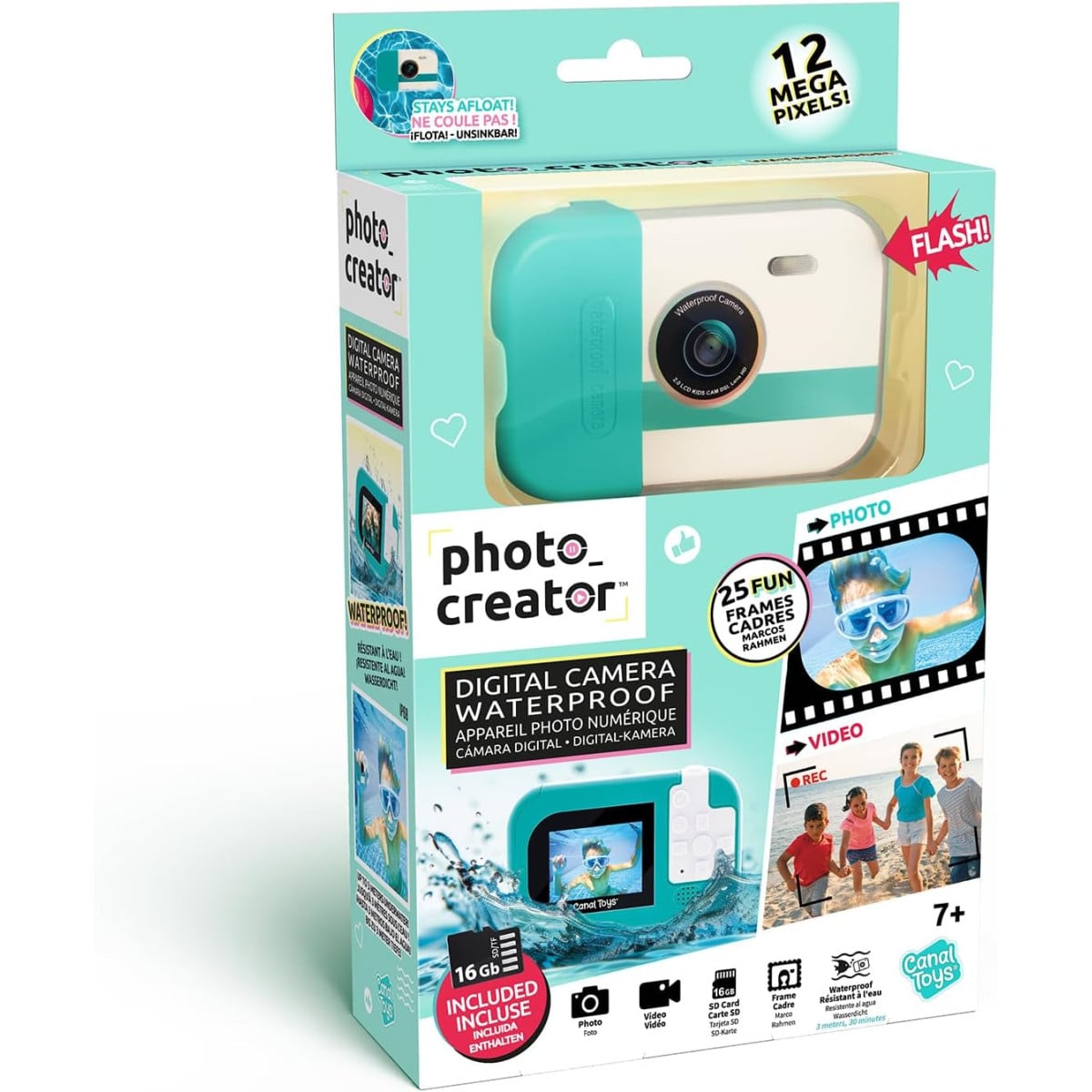 La cámara digital impermeable es perfecta para que los peques capturen sus mejores momentos tanto dentro como fuera del agua. Gracias a su diseño compacto y resistente, podrán hacer fotos y vídeos en cualquier situación, ya sea en la playa, la piscina o de excursión.