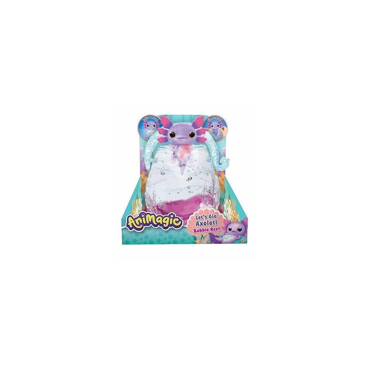 El Animagic Axolote Aquarium es la casita perfecta para tu Axolote. Llena el acuario con agua, presiona el botón mágico de las burbujas y observa cómo tu Axolote baila alrededor de su acogedor hogar. Además, tiene una textura suave y estrujable, pero lo más divertido es que, cuando lo sumerges, ¡le brilla la barriga!.