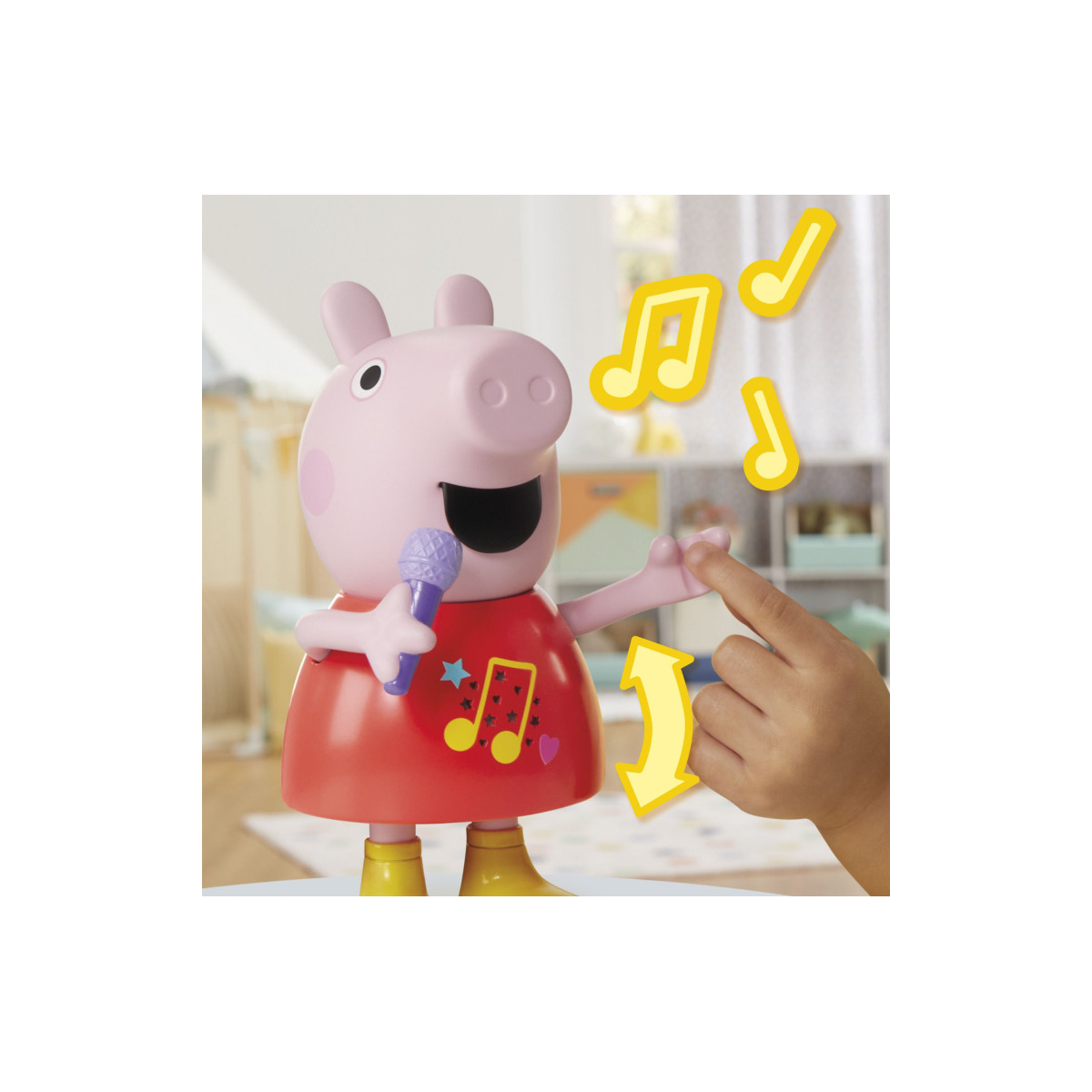 Esta figura interactiva reproduce sonidos y canciones cuando se mueve el brazo con el micrófono, haciendo que los peques se diviertan mientras cantan, bailan y acompañan a Peppa Pig en sus aventuras musicales. Es ideal para fomentar la creatividad, la expresión corporal y el amor por la música desde edades muy tempranas.