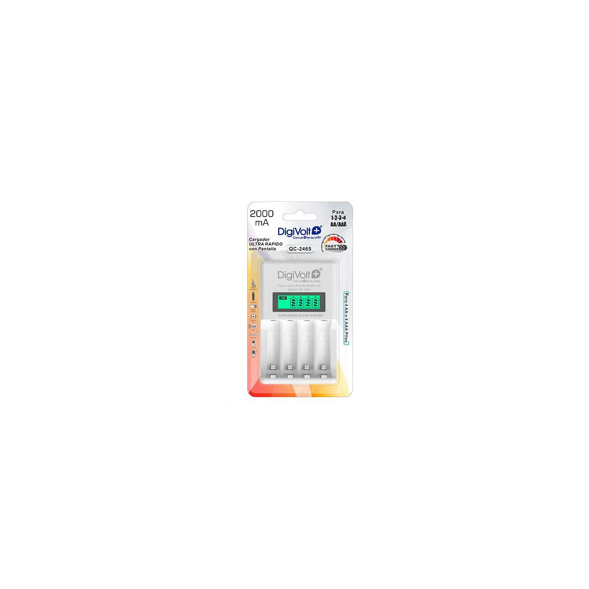 El cargador rápido DigiVolt QC-2465 es una solución práctica y eficiente para quienes necesitan tener siempre pilas listas para el mando de la tele, juguetes, dispositivos pequeños o herramientas del día a día. Su diseño compacto y ligero lo hace perfecto para tenerlo en casa, en la oficina o incluso llevarlo de viaje, ocupando muy poco espacio y ofreciendo una funcionalidad completa.
