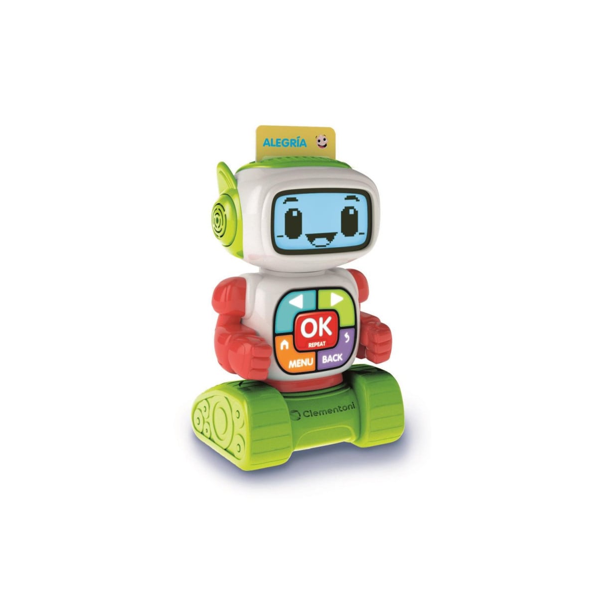 Eddie Robot Interactivo de Clementoni: robot educativo con pantalla LCD, lector integrado y 30 tarjetas ilustradas para que los peques aprendan letras, números, formas y emociones mientras juegan.