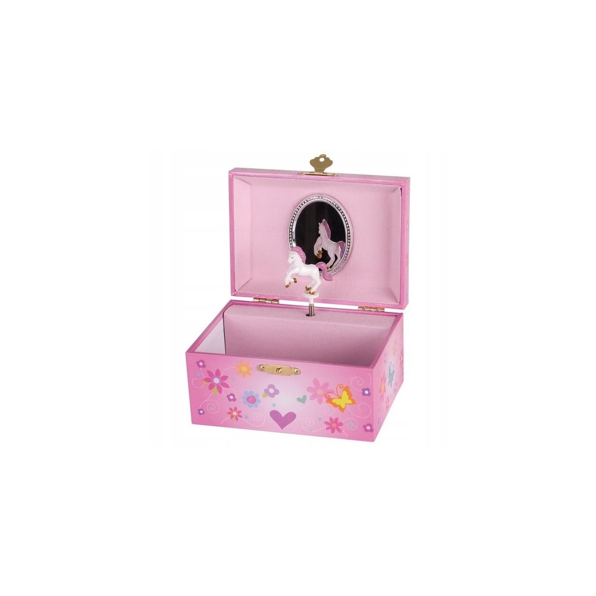 Una cajita de música con un unicornio. Tiene un montón de espacio para almacenar lo que quieras. Cuando la abres suena el Lago de los Cisnes y el unicornio baila.