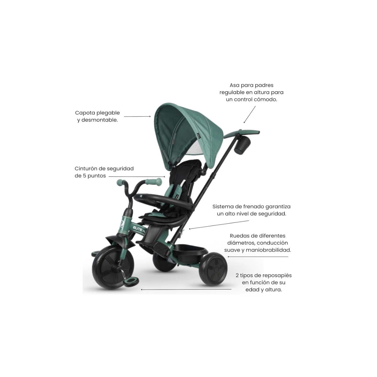 - Incluye: Un triciclo con reposapiés, arnés de 5 puntos, respaldo acolchado, barra de seguridad extraíble, respaldo desmontable, pedales antideslizantes, capota extraíble con protección UV, manillar parental ajustable y cestar frontal y trasera.
