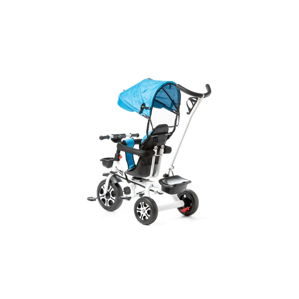 - Incluye: Un triciclo con 3 ruedas, mango regulable a 2 alturas, cinturón de seguridad a 3 puntos de protecciones, barra de seguridad con funda, goma antipinchazos, portaobjetos, portabotellas, reposapies, pedales delanteros, malla de ventilación trasera, respaldo acolchado, asiento regulable a 2 posiciones y capota regulabre en 3 posiciones y extraíble.