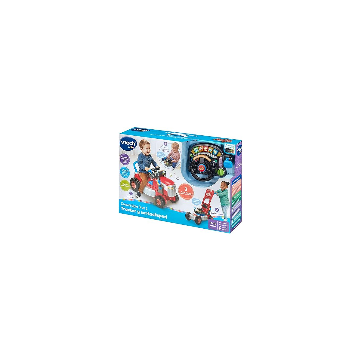 Este juguete Convertible 3 en 1 Tractor y Cortacésped de VTech acompaña a los pequeños en sus primeros pasos y les ofrece diversión interactiva. Diseñado para niños desde 12 meses, comienza como tractor: el niño se sienta y lo impulsa con sus piernas, fortaleciendo su equilibrio. Con un simple giro, se transforma en un cortacésped de empuje, ayudando al niño a practicar sus primeros pasos con seguridad.