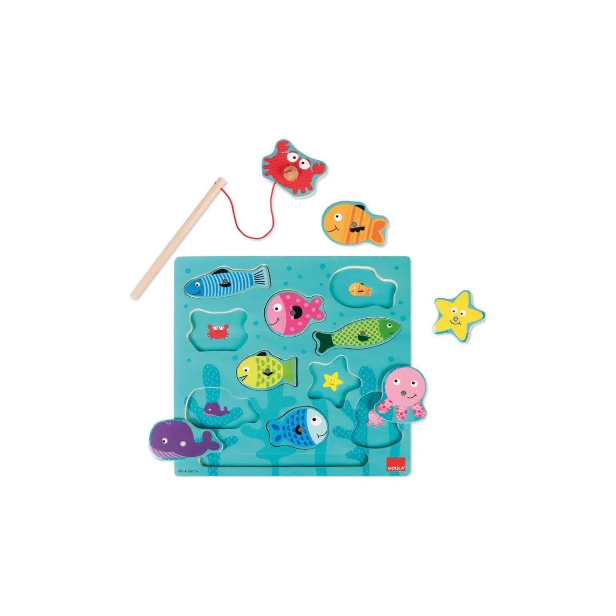 Un puzle magnético de pesca con peces y caña de pescar. Es ideal para desarrollar la destreza manual y la coordinación ojo-mano.