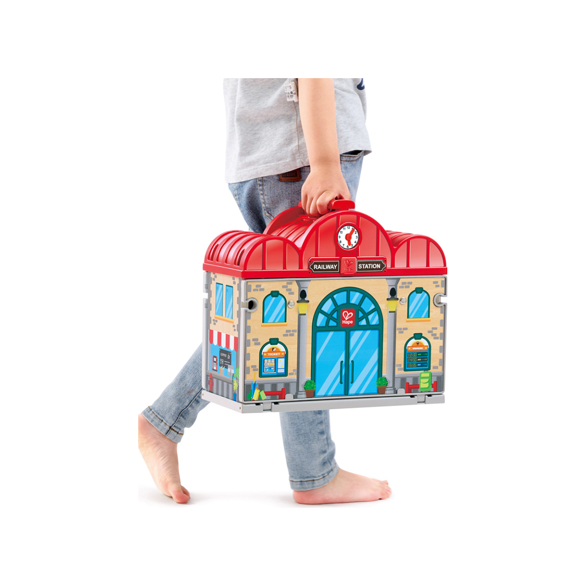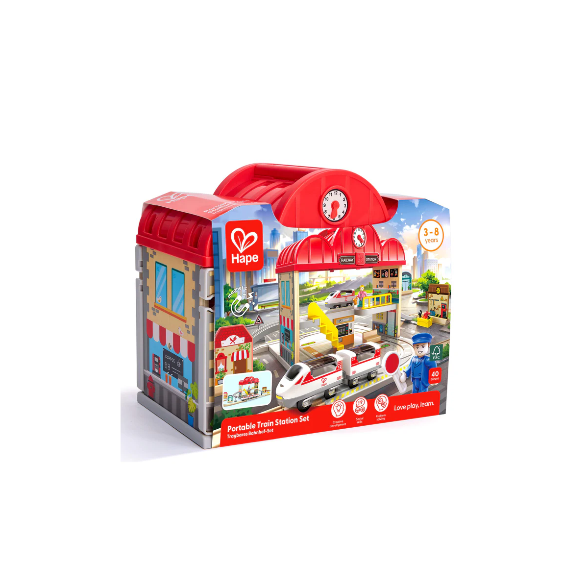 Set de estación de tren portátil Hape con vías, tren y accesorios. Incluye 40 piezas y una estación que sirve como caja de transporte para jugar y guardar todo fácilmente.